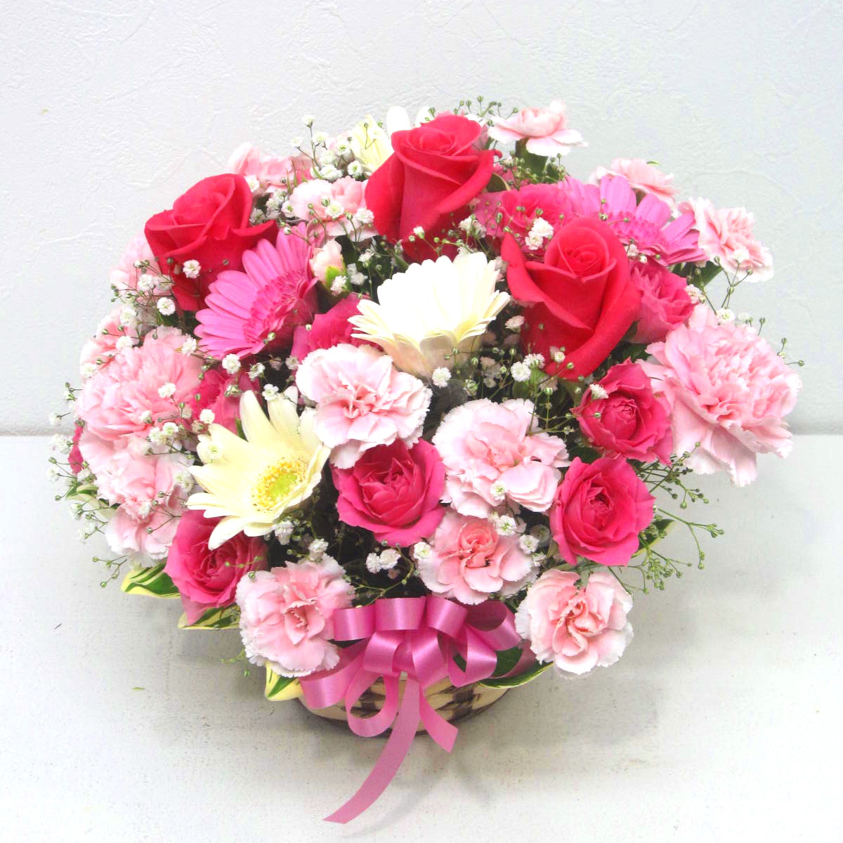 ピンクバラとガーベラ、カスミソウを入れたアレンジメントです。ボリューム感もあり上品な雰囲気な方へのプレゼントにオススメです。きっととびっきりに喜んでいたただけると思います。当店ではお客様の想い大切に【こころを込めて】お作りいたします。静岡県長泉町から手渡しお届けまたは宅急便で全国にお届けします。是非、さまざまな贈り物に。