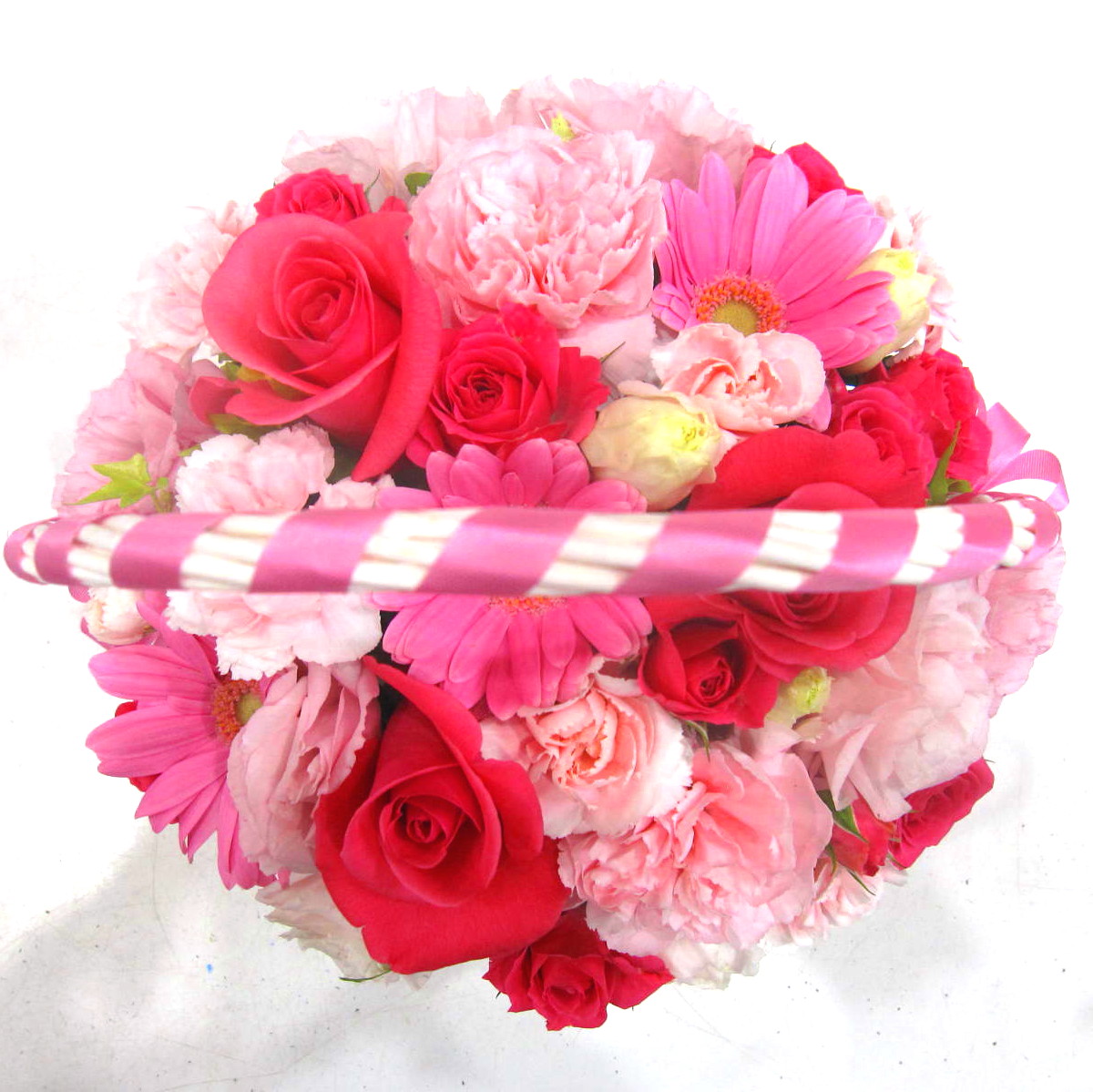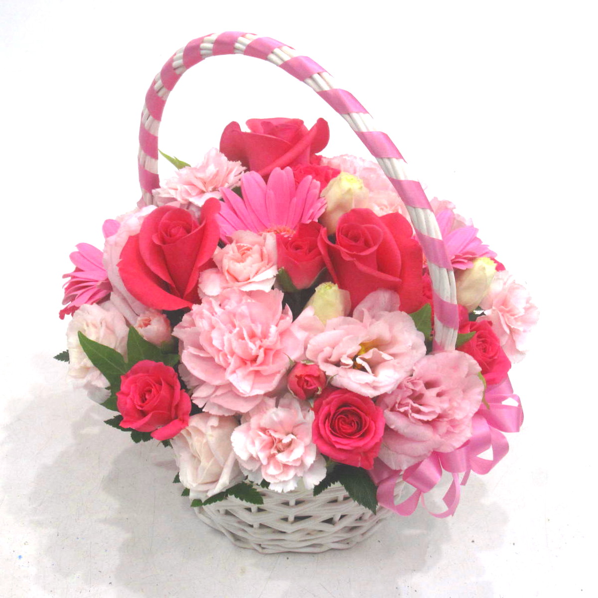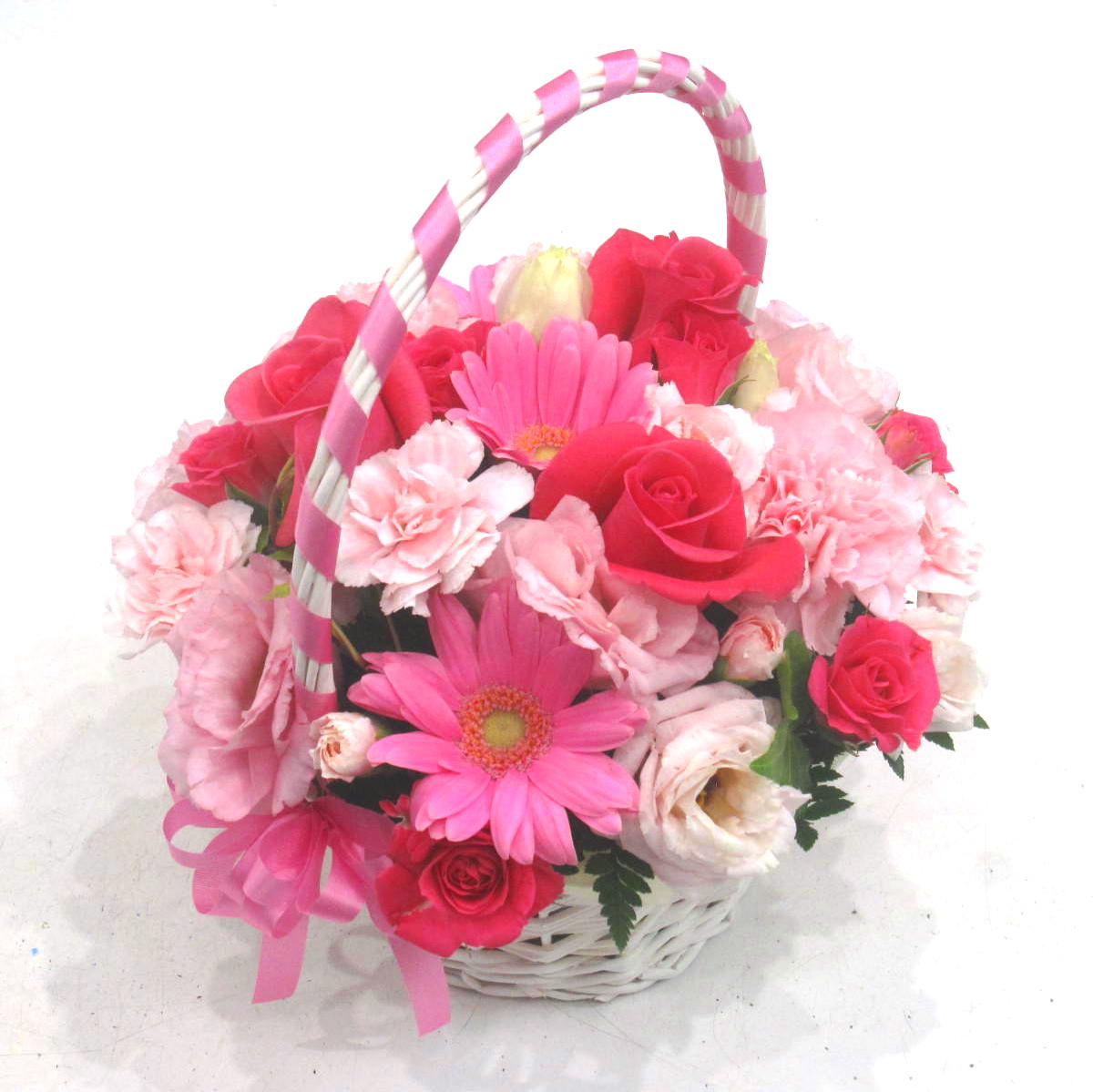 バラやガーベラ、カーネーションなどのお花を入れて、他、季節のお花でお作りします。可愛い手付きのバスケットと両サイドにピンクのリボンをアクセントにしたアレンジです。ボリューム感もありますよ。言葉では照れくさい想いをきっと届けてくれるアレンジです。当店ではお客様の想いを大切に【こころを込めて】お作りいたします。静岡県長泉町から手渡しお届けまたは宅急便で全国にお届けします。是非、さまざまな贈り物に。