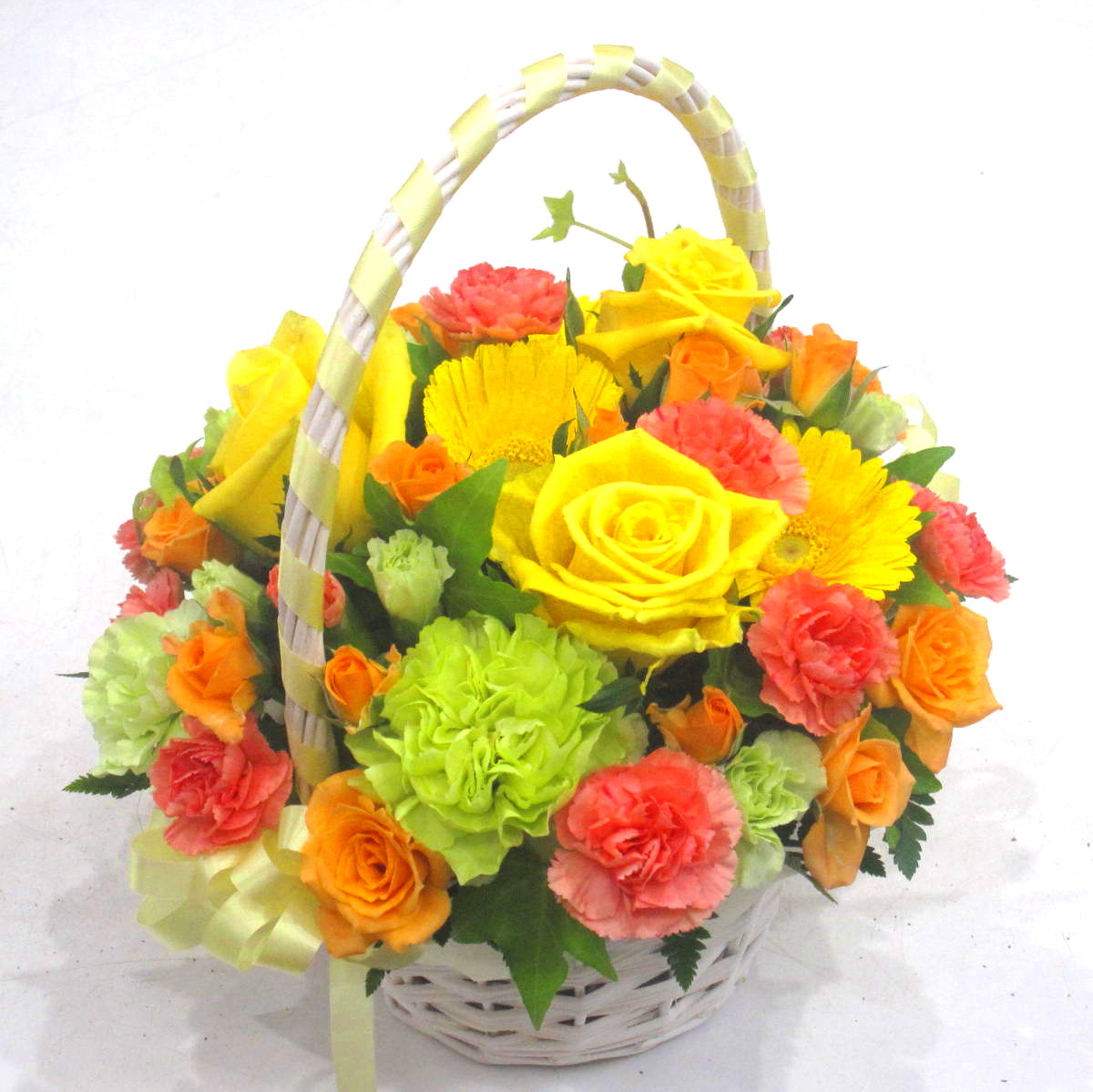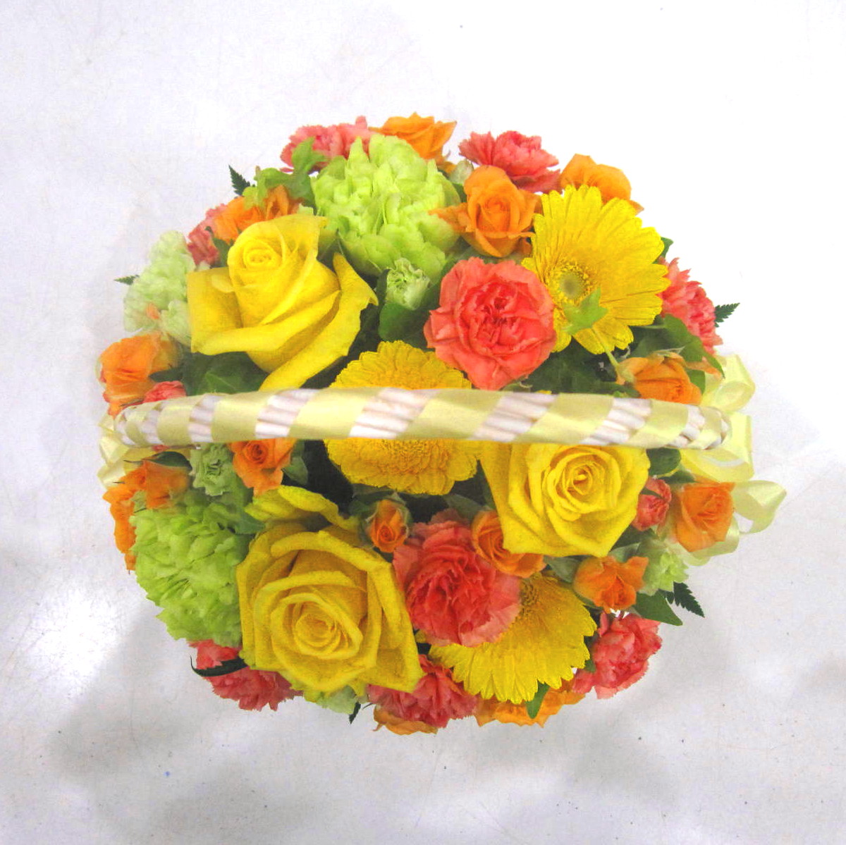 バラやガーベラ、カーネーションなどのお花を入れて、他、季節のお花でお作りします。可愛い手付きのバスケットと両サイドに黄色のリボンをアクセントにしたアレンジです。ボリューム感もありますよ。言葉では照れくさい想いをきっと届けてくれるアレンジです。当店ではお客様の想いを大切に【こころを込めて】お作りいたします。静岡県長泉町から手渡しお届けまたは宅急便で全国にお届けします。是非、さまざまな贈り物に。