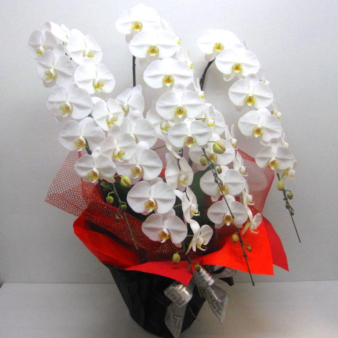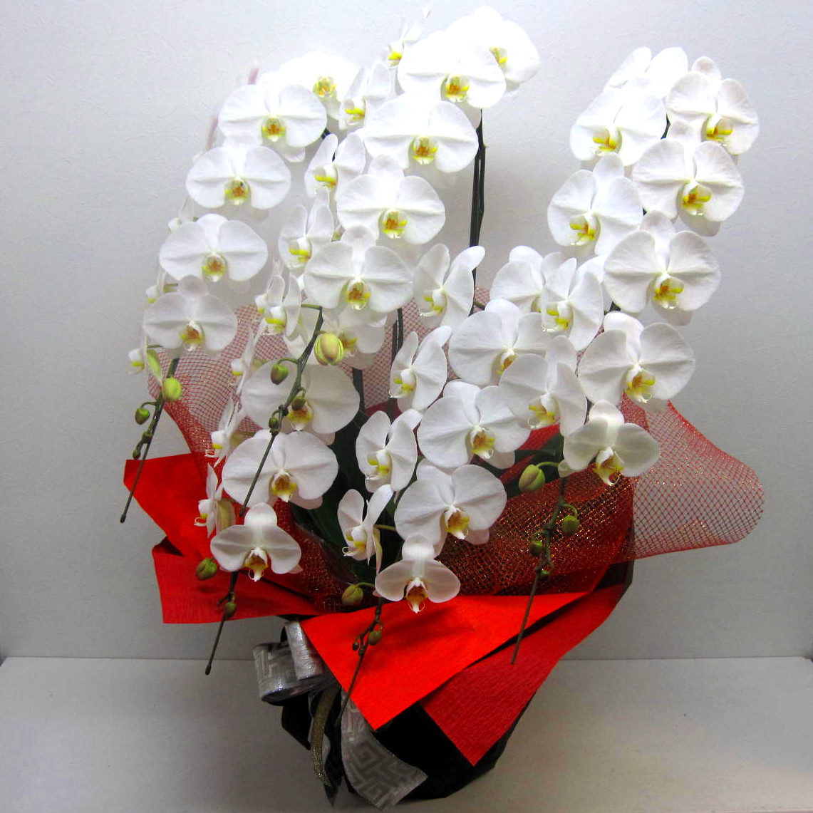 ラッピングにもこだわった迫力が違う大輪系の胡蝶蘭【白】5本立てです。お花は大輪系で花径が約10cmでとっても豪華な感じです。黄色のリップなので見た目上品な感じです。輪数はざっとツボミまで入れると65輪以上です。もちろん花持ち抜群です。大きさは迫力満点、ドーン!!と大きいサイズです。お誕生日や開店・開業祝い、事務所移転祝いなど是非、さまざまな御祝ギフトに。その他、わからないことやご相談等ございましたらお気軽にお問合せ下さい。