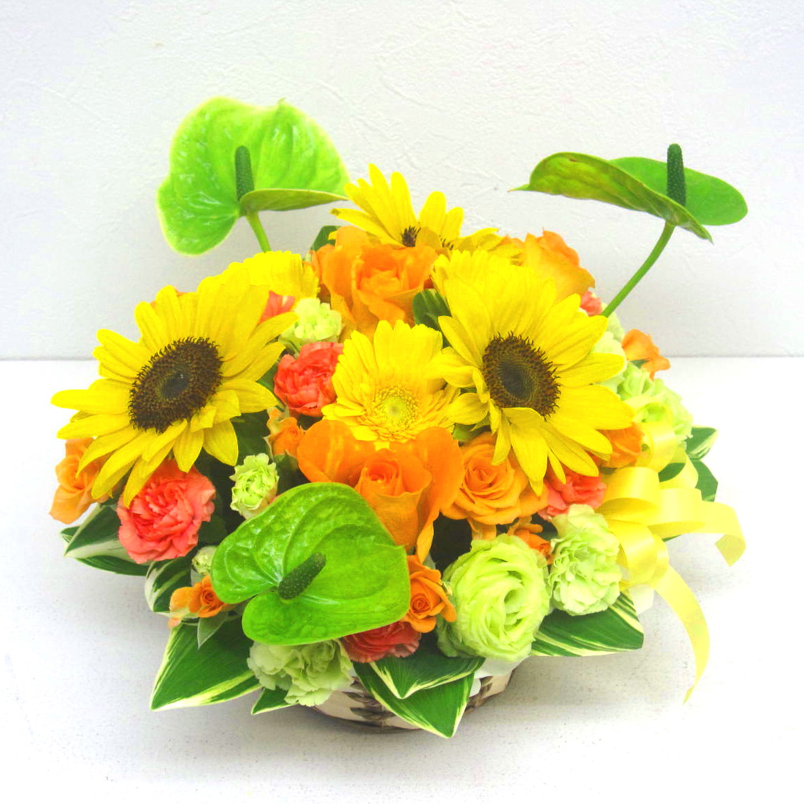 【ひまわり】と【アンスリューム】を入れ、イエロー&オレンジ&グリーン系で上品にオールラウンドで制作。どこから見ても綺麗に見えます。きっととびっきりに喜んでいたただけると思います。また、持ちの良いお花を中心に使っておりますので花持ちも良いでしょう。ご購入されたお客様から高い評価を頂いております。静岡県長泉町から日本全国【真心】込めてお届けいたします。さまざまなご用途に贈る贈り物としてオススメです。大切な方へ贈るフラワーギフトやプレゼントなら「花樹園オンラインドットコム」に是非、お任せ下さいませ。
