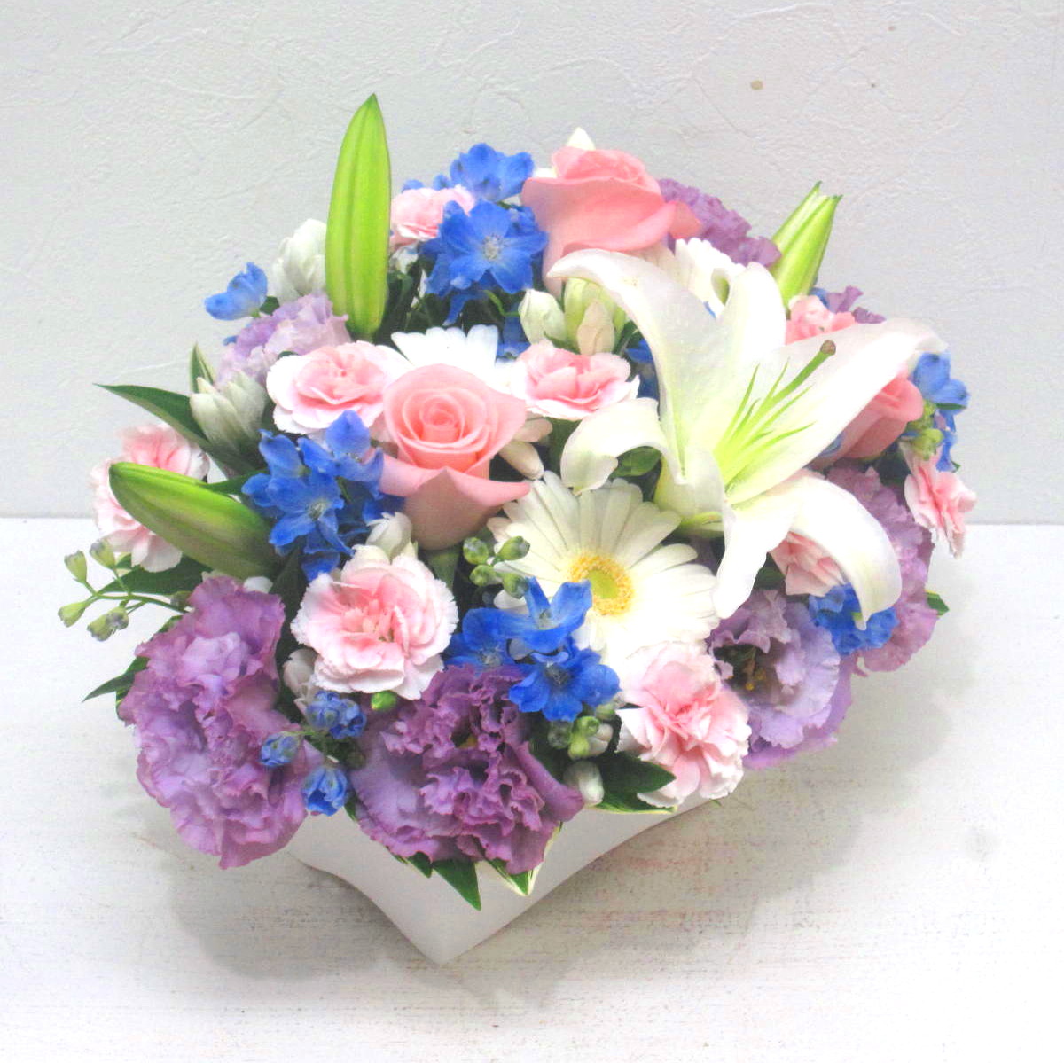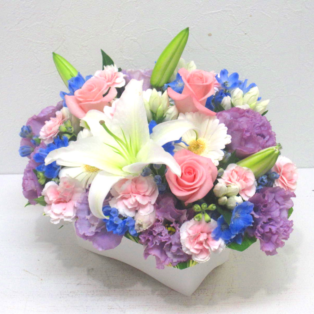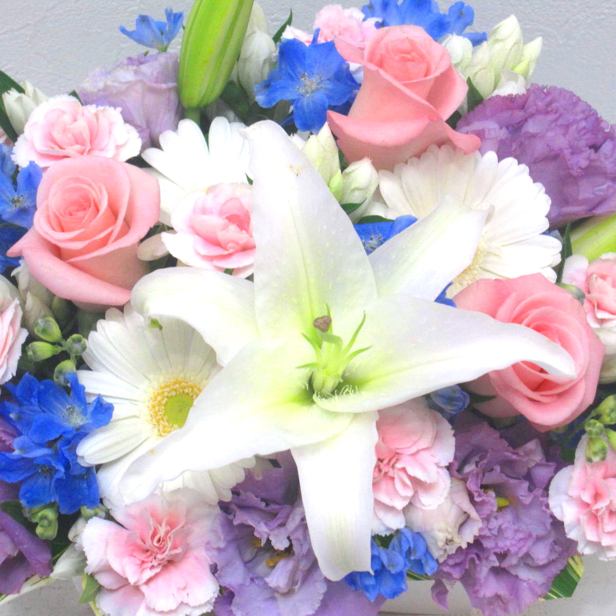白&ブルー&ピンク&パープルの淡い色主体でお作りしました。ユリやバラ、ガーベラなどを入れたちょっぴり涼しげで心が温まるような雰囲気です。華やかなボリューム感です。きっととびっきりに喜んでいたただけると思います。当店ではお客様の想い大切に【こころを込めて】お作りいたします。静岡県長泉町から手渡しお届けまたは宅急便で全国にお届けします。是非、さまざまな贈り物に。。。