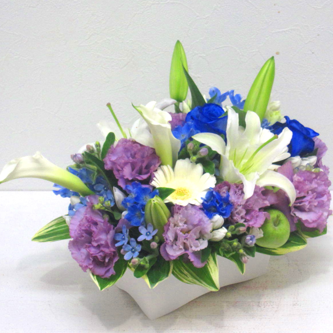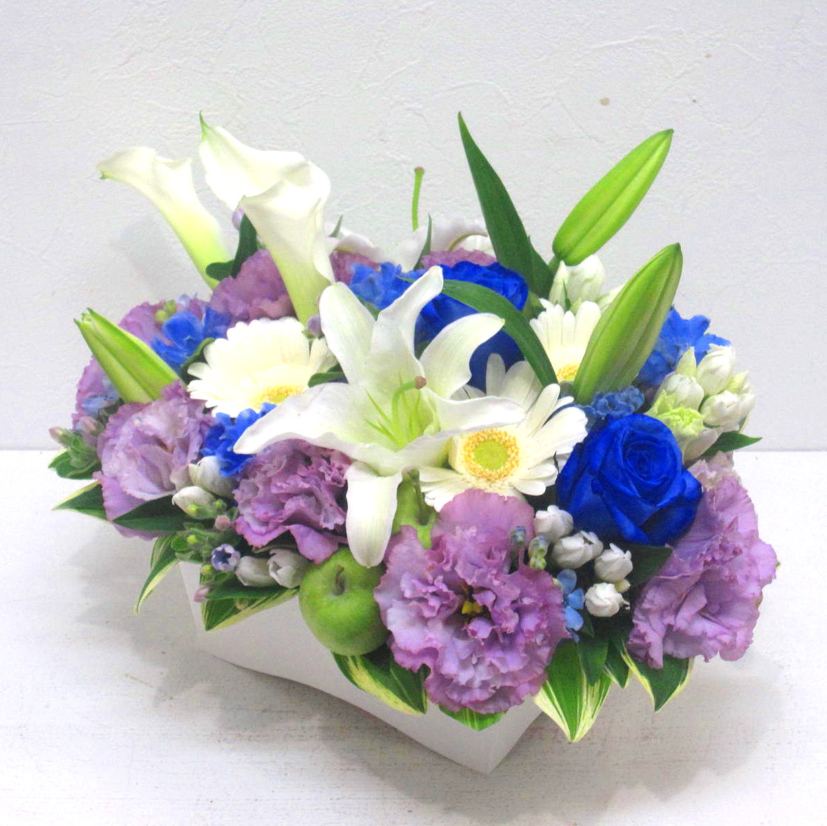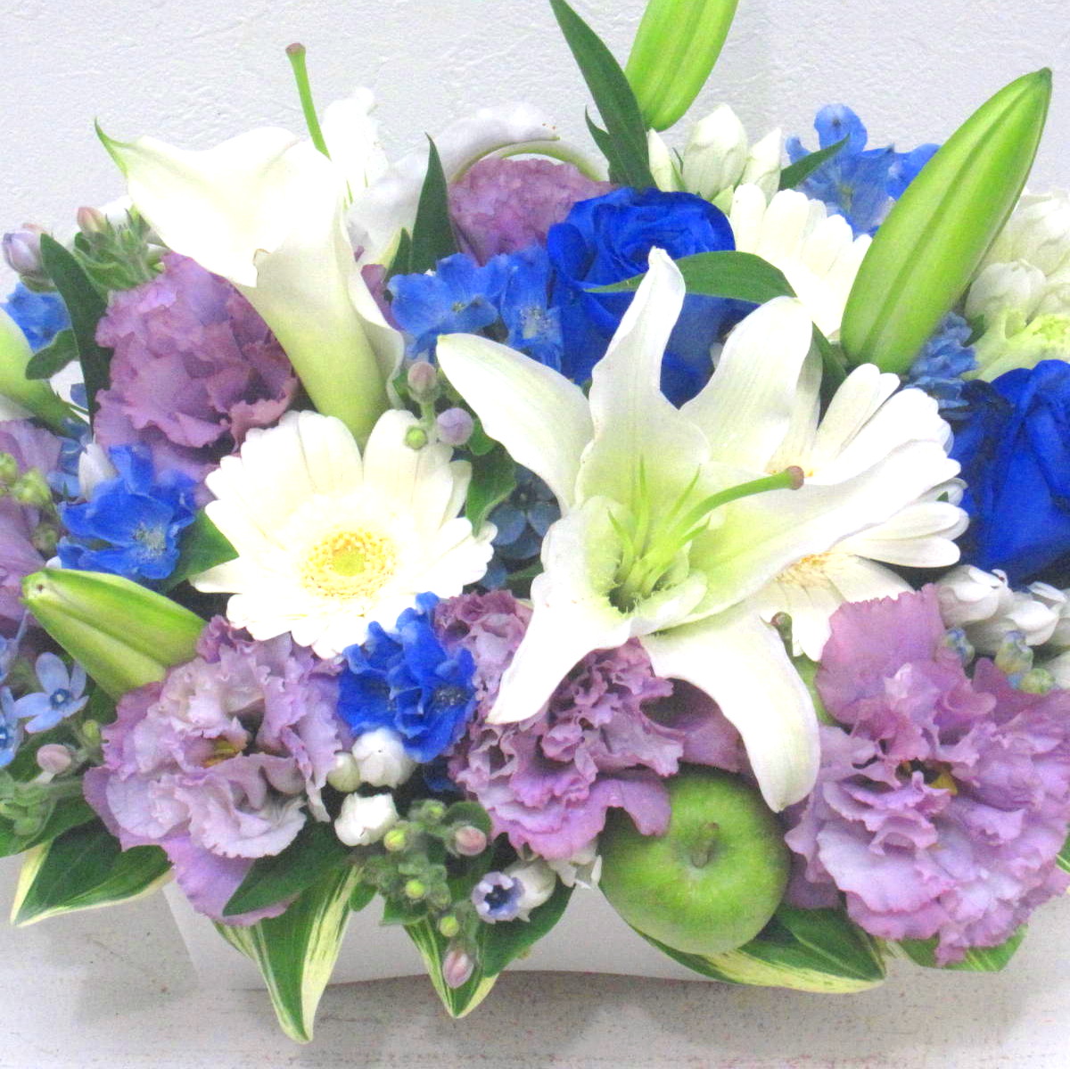 白&ブルー&パープルで涼しげにお作りしました。カラーを入れてナチュラル感を演出、とっても素敵な雰囲気で華やかなボリュームです。きっととびっきりに喜んでいたただけると思います。当店ではお客様の想い大切に【こころを込めて】お作りいたします。静岡県長泉町から手渡しお届けまたは宅急便で全国にお届けします。是非、さまざまな贈り物に。。。