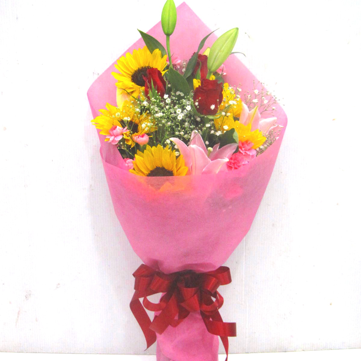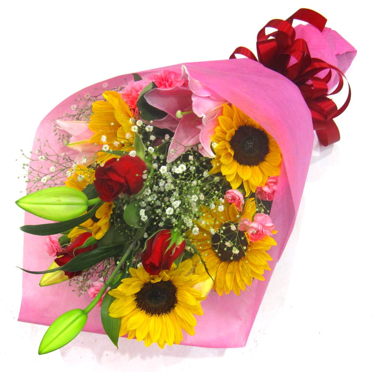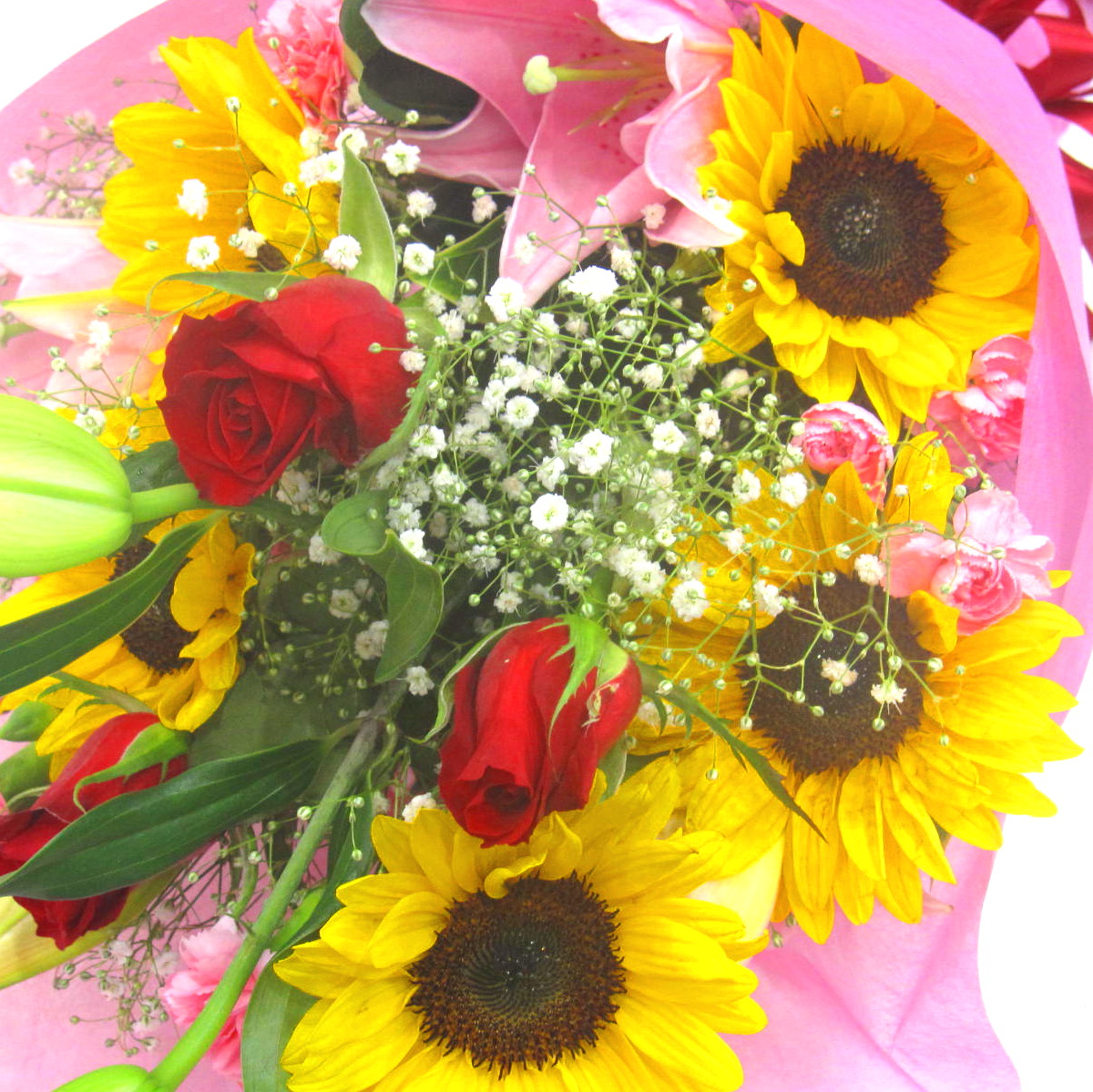 ピンクのユリを入れた華やかな花束です。ヒマワリも入ってとっても可愛いです。ボリューム感のある花束をお探しの方にオススメです。また、持ちの良いお花を中心に使っておりますので花持ちも良いでしょう。ご購入されたお客様から高い評価を頂いております。静岡県長泉町から日本全国【真心】込めてお届けいたします。さまざまなご用途に贈る贈り物としてオススメです。大切な方へ贈るフラワーギフトやプレゼントなら「花樹園オンラインドットコム」に是非、お任せ下さいませ。