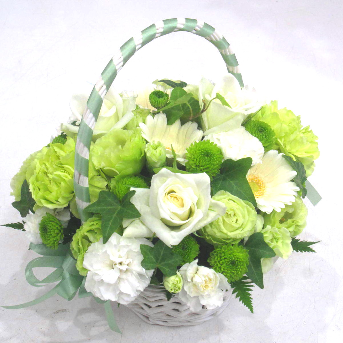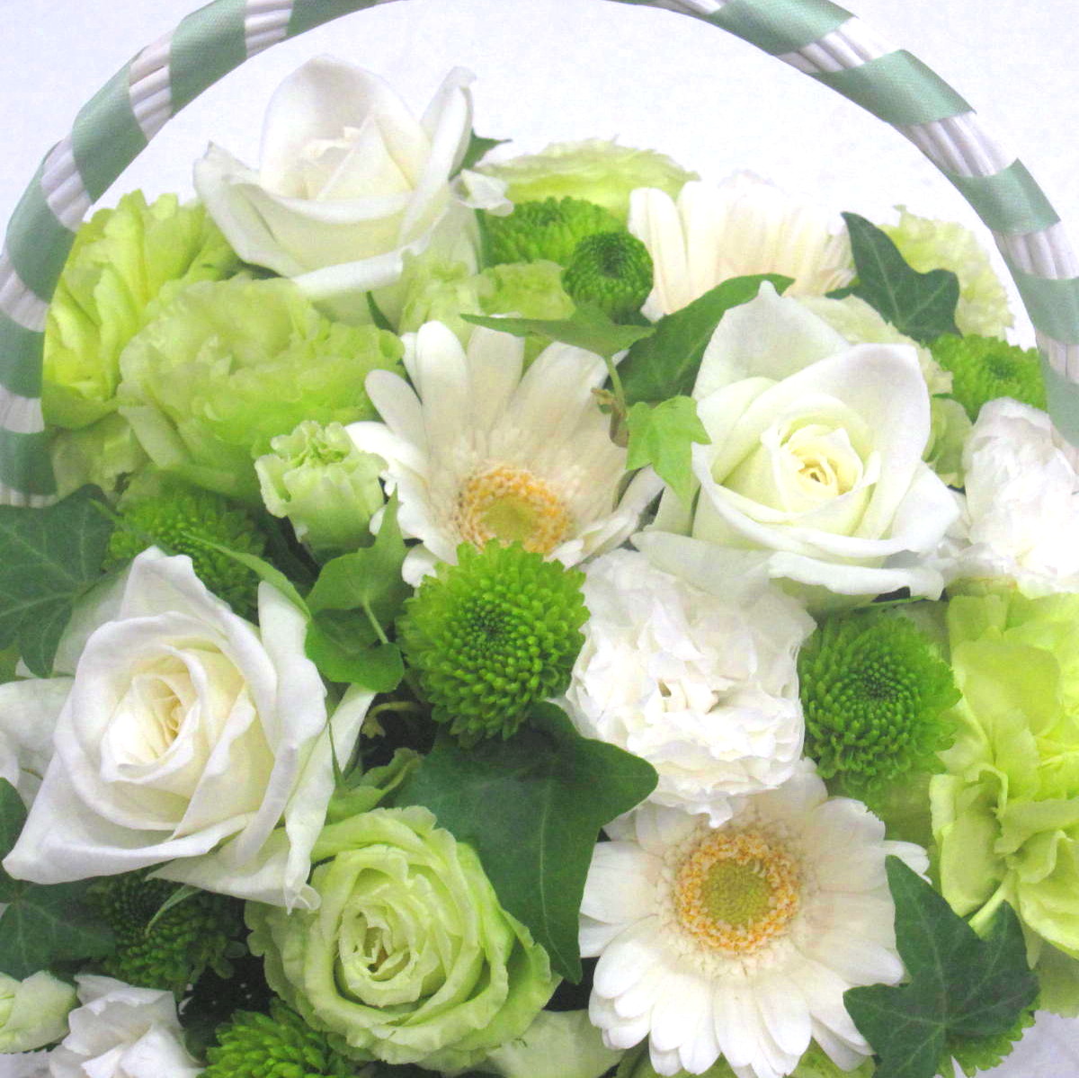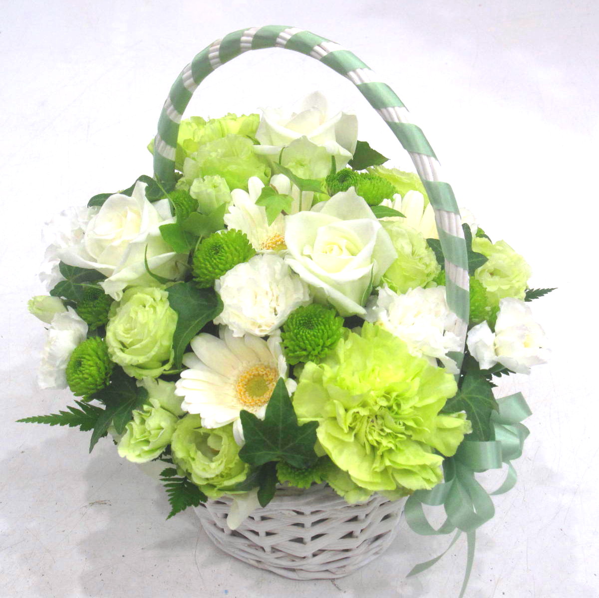 資材・ラッピング: 手付きバスケット、リボン、吸水性スポンジ、コミニュケーションカード(取扱説明書)