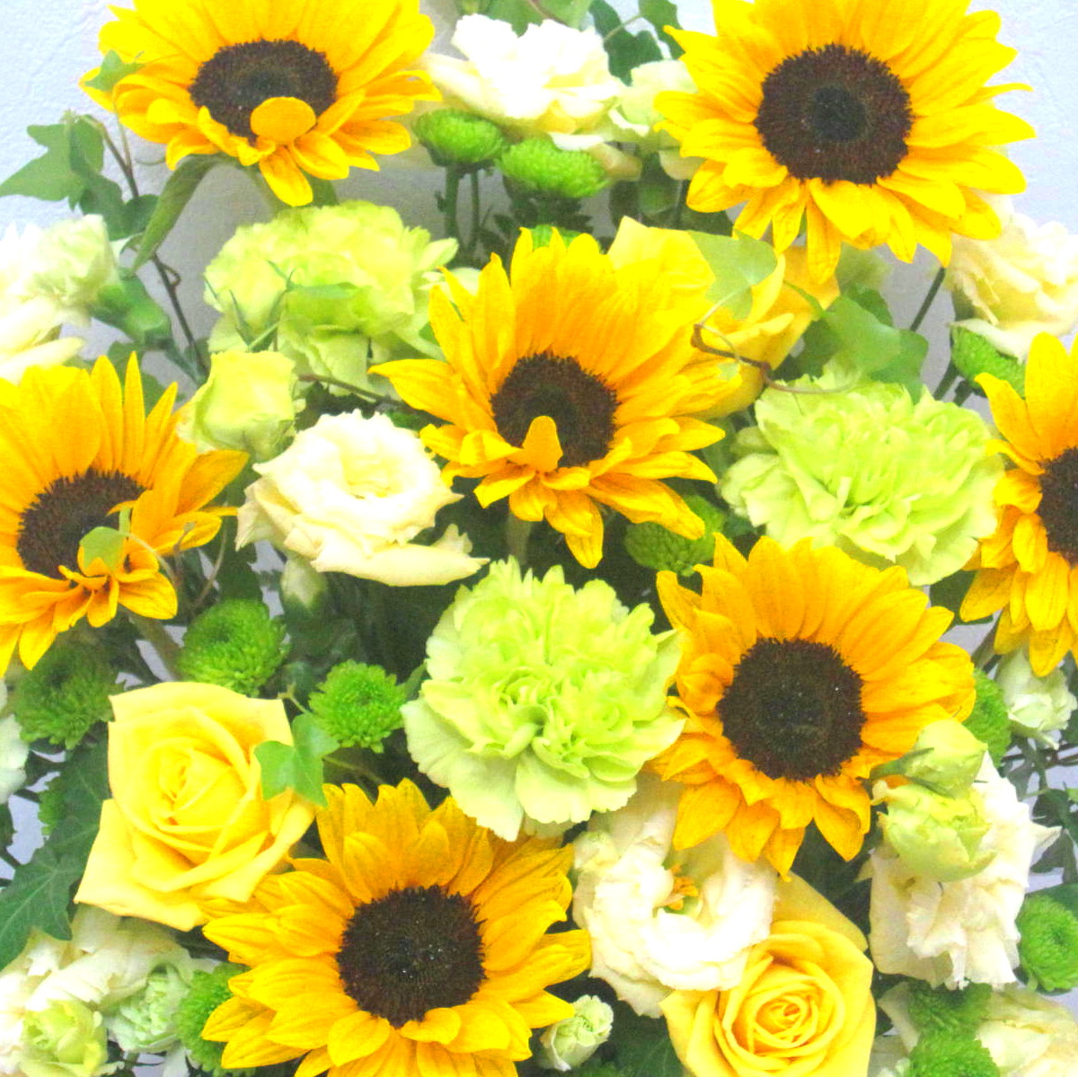 あの人を偲んで…。ひまわりを入れた明るい御供え用アレンジです。ペットのお供え花にも使用できます。目を閉じて心の中にいる故人への想いをそっと呼び起こします。当店では、お客様のその想いをしっかりと受け止め、心を込めて制作致します。静岡県から全国へお届けします。故人を偲ぶ色々なシーンで是非、ご利用下さい。