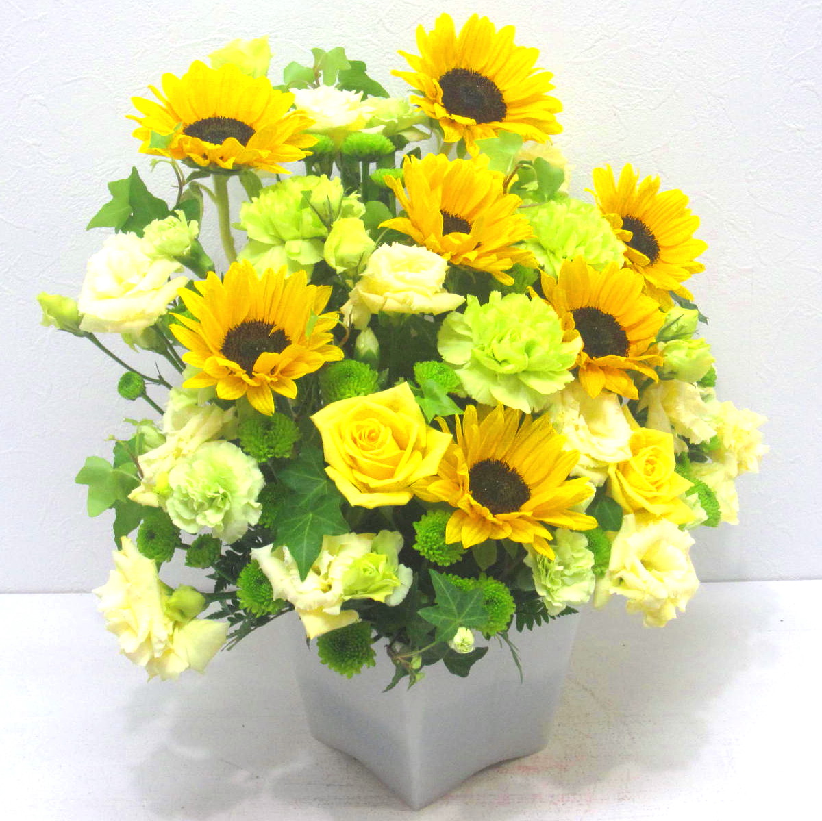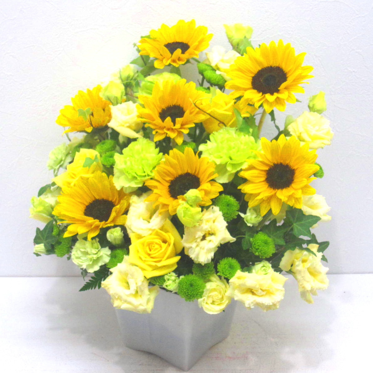 ひまわりを入れた御供え用アレンジメント。ペットのお供え花にも使用できます。【15時迄のご注文で翌日届きます】※こちらの商品についてのご相談、ご質問等ございましたら(メール)または(お電話)にて承ります。