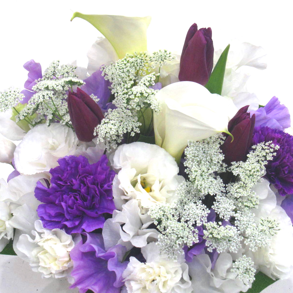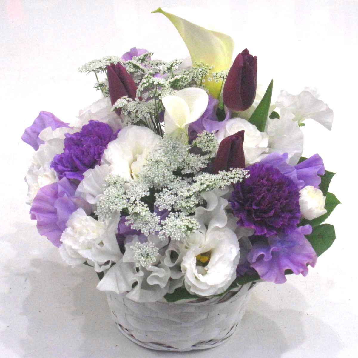 あの人を偲んで…。白&パープル系の上品な御供え用アレンジメントです。優しい雰囲気で上品にお作りします。また、その日、市場から入荷した鮮度の良いお花でお作りしますので花持ちが良く、ご利用いただいたお客様から「大変花持ちが良い」と高い評価をいただいております。目を閉じて心の中にいる故人への想いをそっと呼び起こします。当店では、お客様のその想いをしっかりと受け止め、心を込めて制作致します。静岡県から全国へお届けします。春の故人を偲ぶ色々なシーンで是非、ご利用下さい。