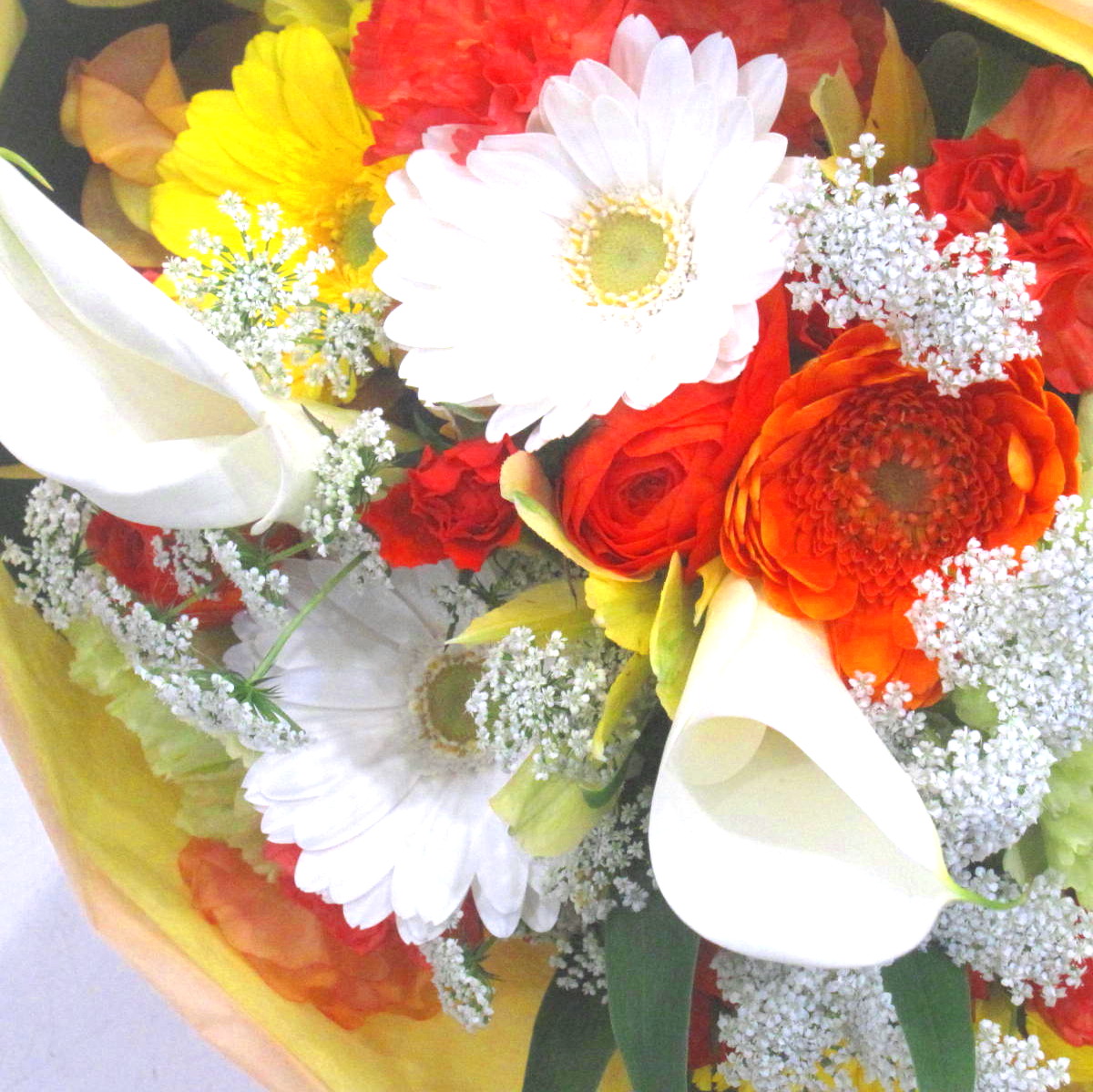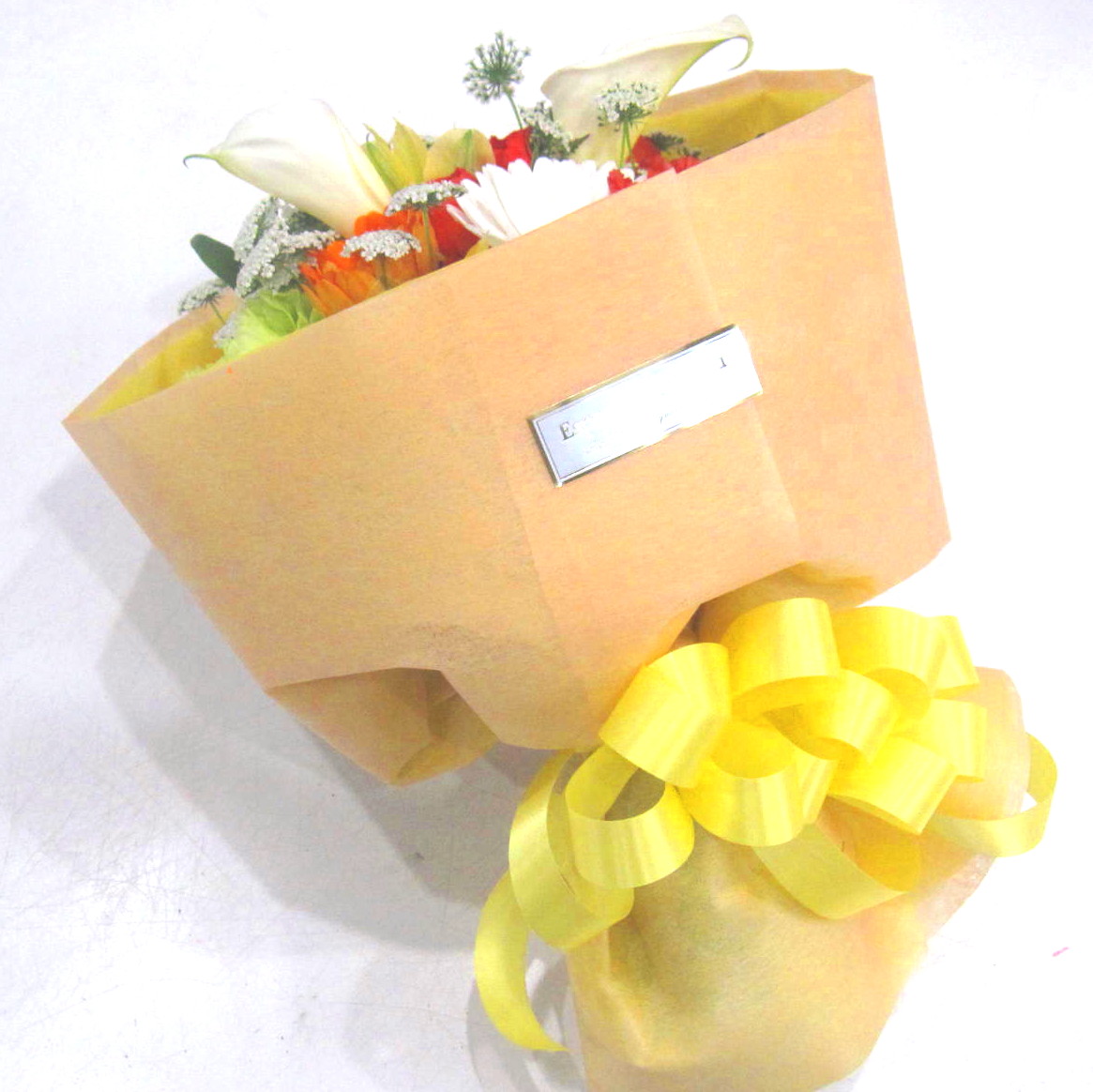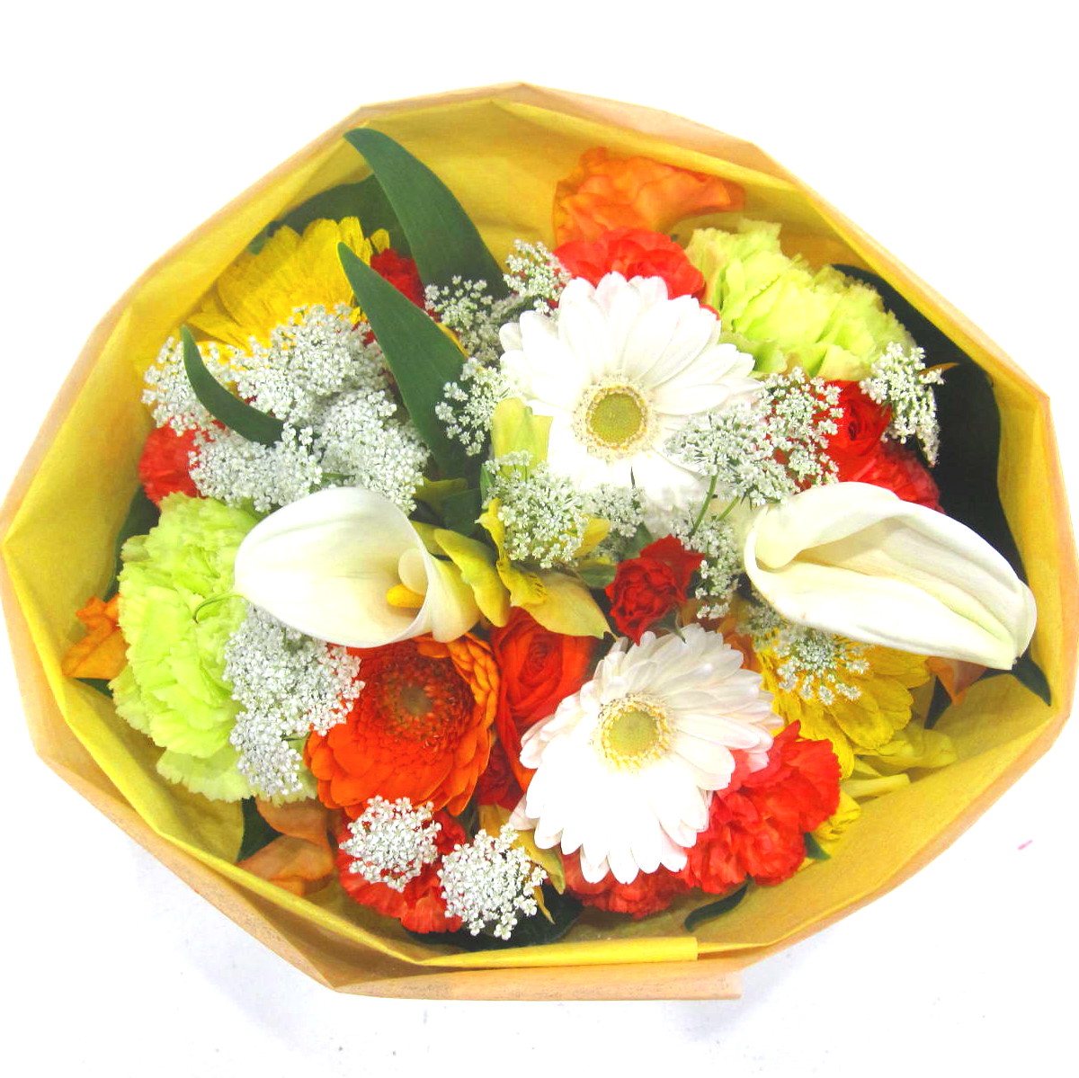 春の贈り物に大人気のポカポカするような色合いの可愛らしいブーケ風花束。【15時迄のご注文で翌日届きます】※こちらの商品についてのご相談、ご質問等ございましたら(メール)または(お電話)にて承ります。