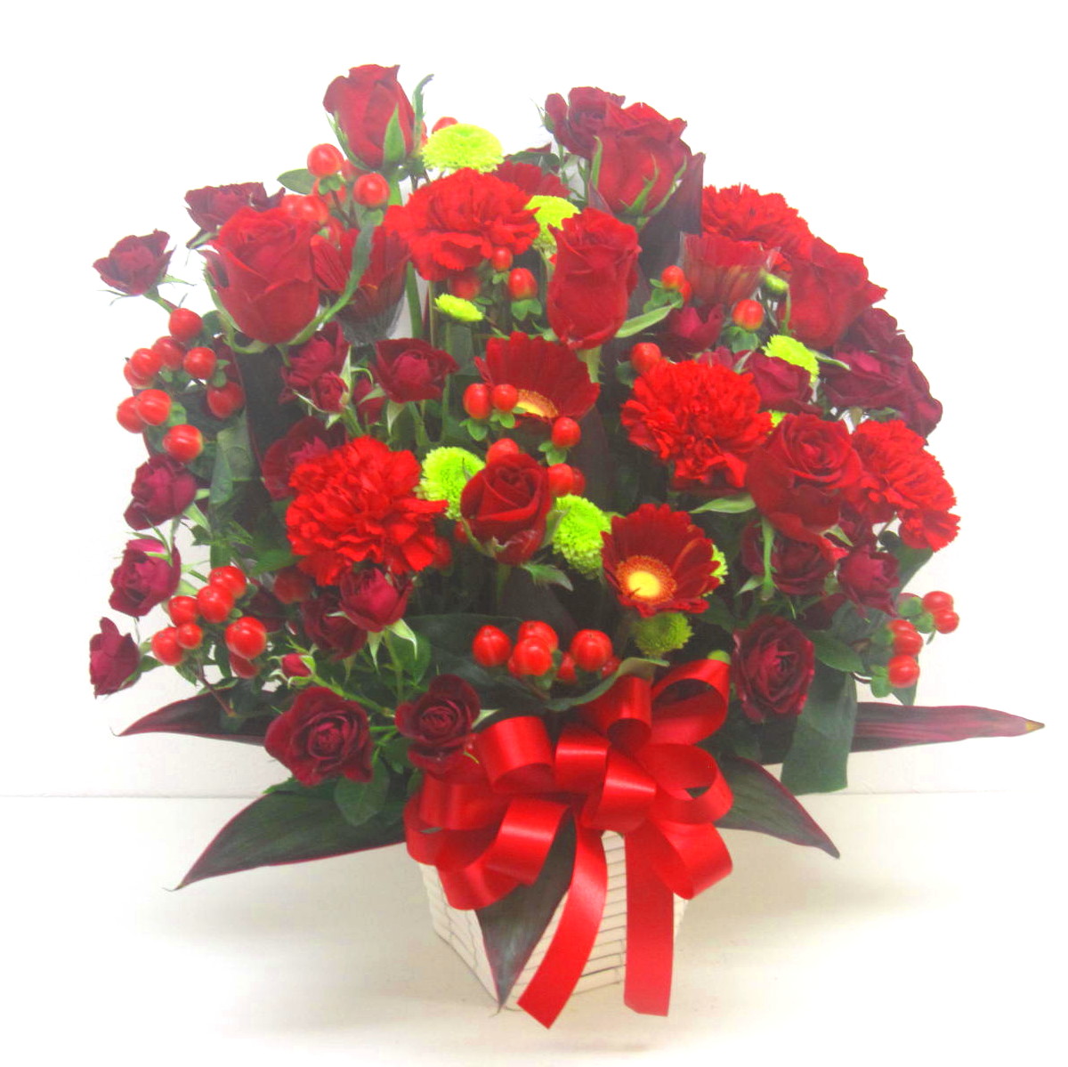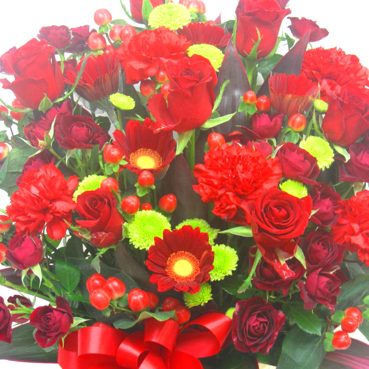 赤いバラを入れた華やかな素敵なレッド系アレンジメント。【15時迄のご注文で翌日届きます】※こちらの商品についてのご相談、ご質問等ございましたら(メール)または(お電話)にて承ります。