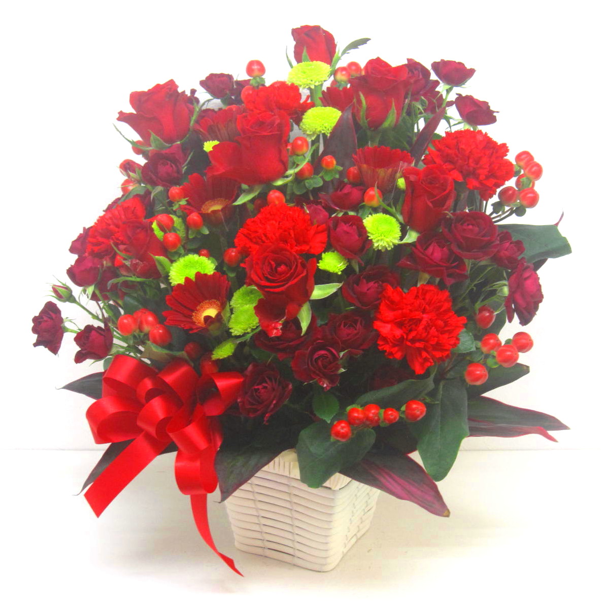 赤いバラ中心のアレンジメントです。シンプルで素敵なバスケットに華やかにアレンジしました。きっととびっきりに喜んでいたただけると思います。当店ではお客様の想いを大切に【こころを込めて】お作りいたします。静岡県長泉町から手渡しお届けまたは宅急便で全国にお届けします。是非、さまざまな贈り物に。