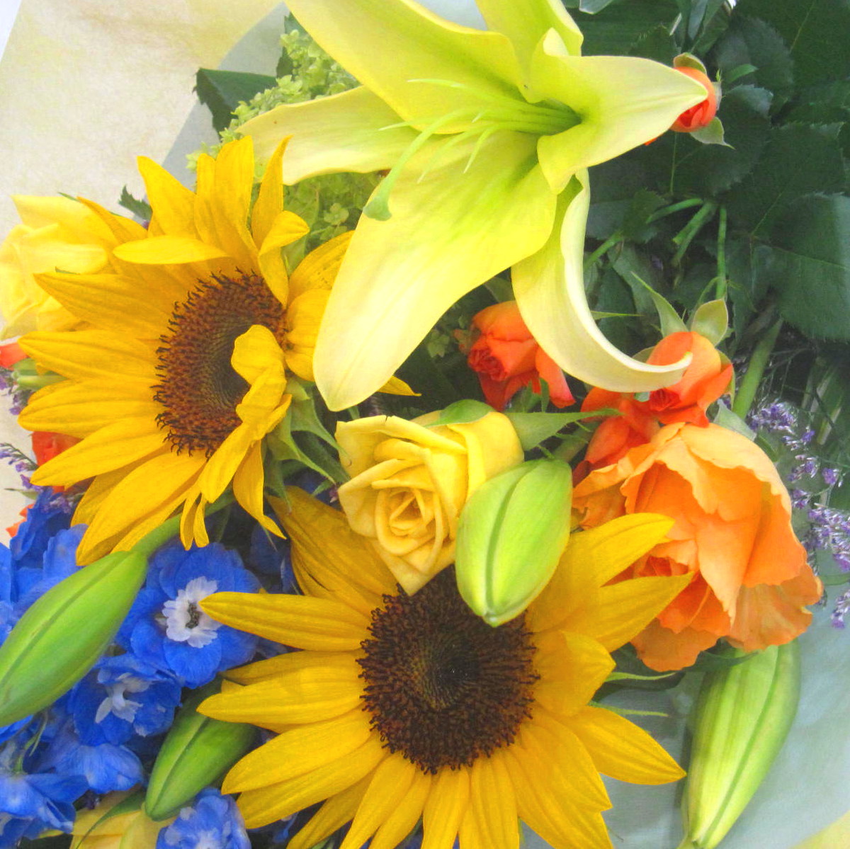 花材: メイン ユリ、バラ、ひまわりなど その他 葉物類など