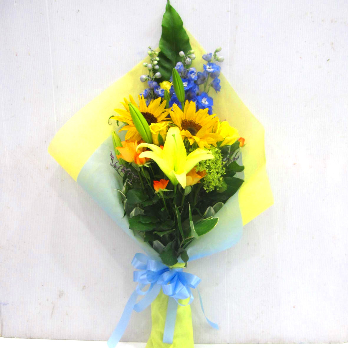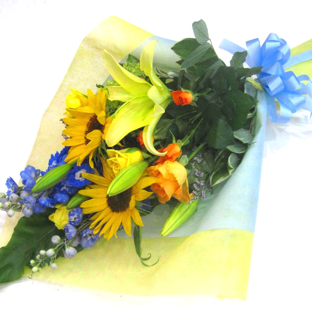 ひまわりを入れた華やかな花束です。ラッピングで涼しげな雰囲気を演出。華やかで夏らしい季節を感じる花束です。また、持ちの良いお花を中心に使っておりますので花持ちも良いでしょう。ご購入されたお客様から高い評価を頂いております。静岡県長泉町から日本全国【真心】込めてお届けいたします。さまざまなご用途に贈る贈り物としてオススメです。大切な方へ贈るフラワーギフトやプレゼントなら「花樹園オンラインドットコム」に是非、お任せ下さいませ。