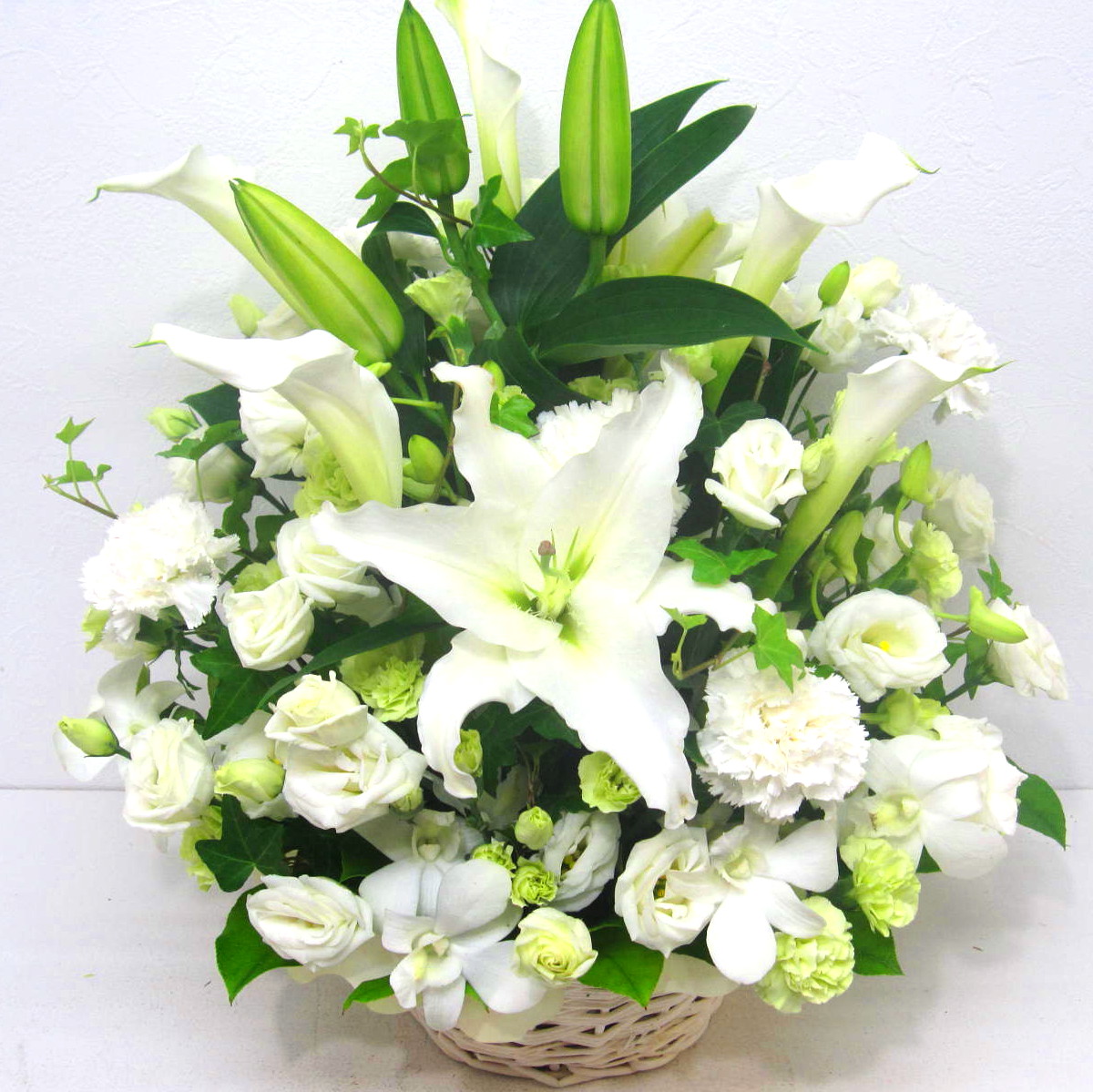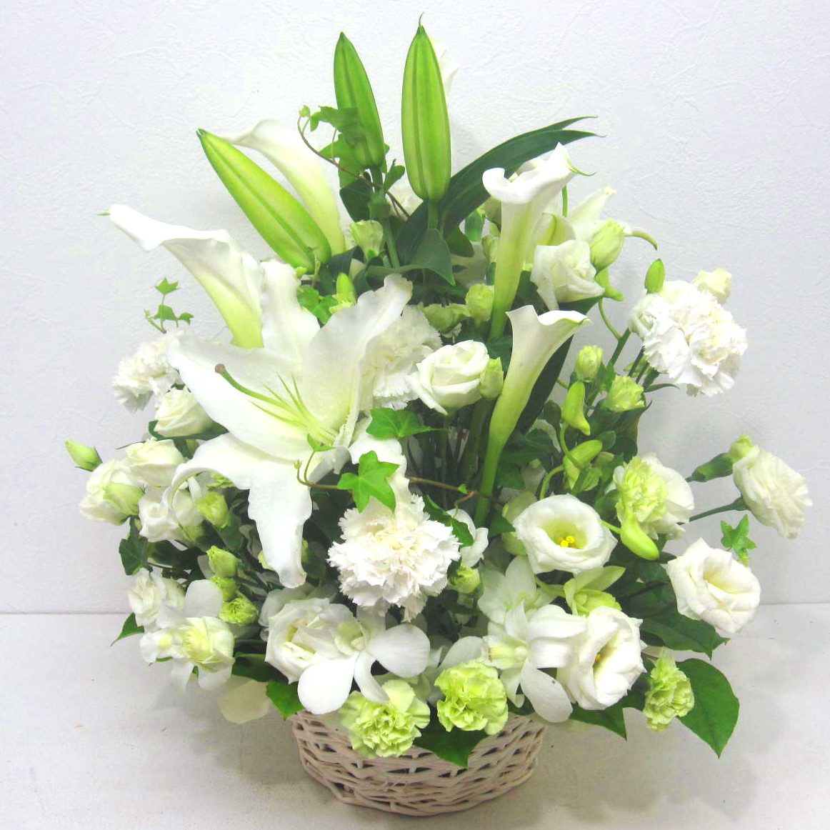 あの人を偲んで・・・白いユリを入れて洋花でお作りします。【15時迄のご注文で翌日届きます】※こちらの商品についてのご相談、ご質問等ございましたら(メール)または(お電話)にて承ります。