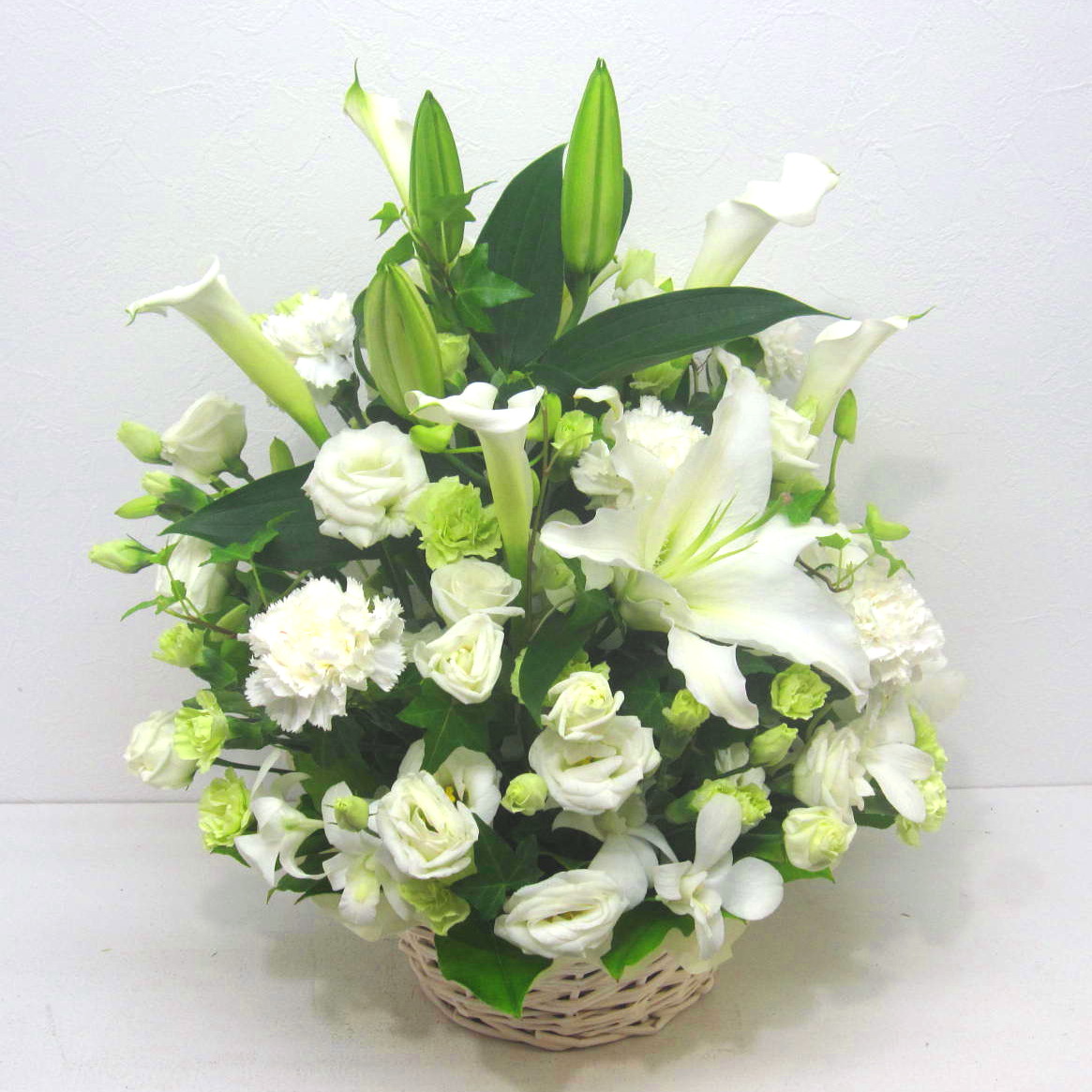 あの人を偲んで…。白いユリの入った洋花のみの御供え用アレンジです。白上がりで上品にお作りします。当店ではお客様の想い大切に【こころを込めて】お作りいたします。静岡県長泉町から手渡しお届けまたは宅急便で全国にお届けします。故人を偲ぶさまざまなシーンでお使い頂けます。