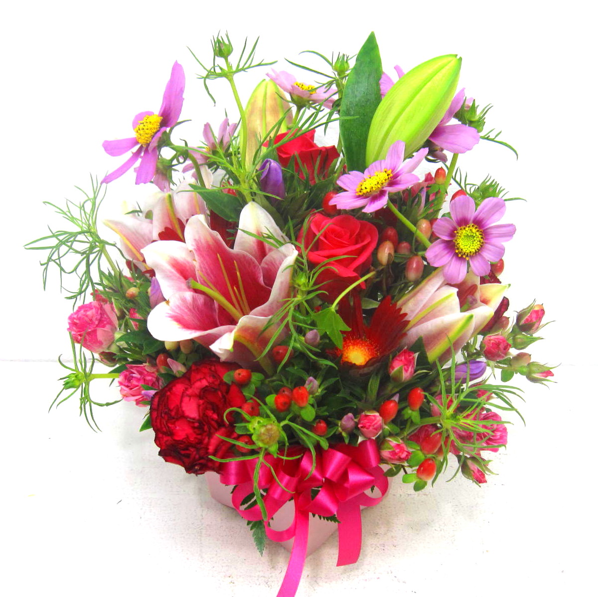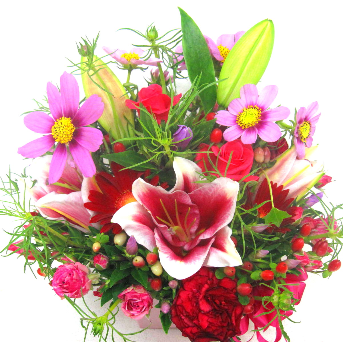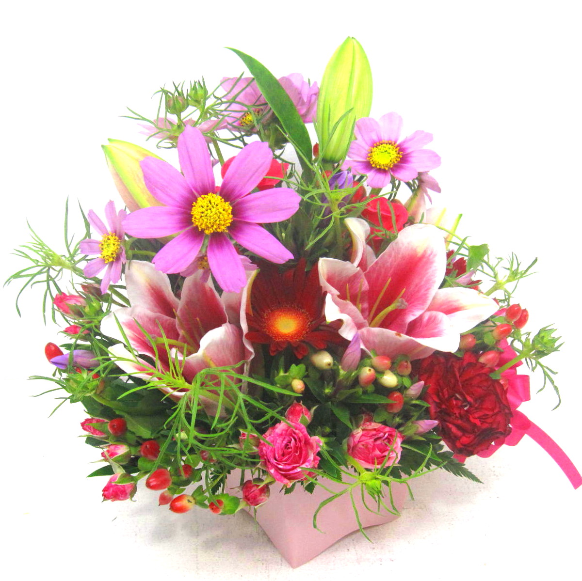 秋の花材(コスモス、リンドウ、ワレモコウ)に大きく華やかに咲くユリを入れたボリューム感のあるアレンジメント。【15時迄のご注文で翌日届きます】※こちらの商品についてのご相談、ご質問等ございましたら(メール)または(お電話)にて承ります。