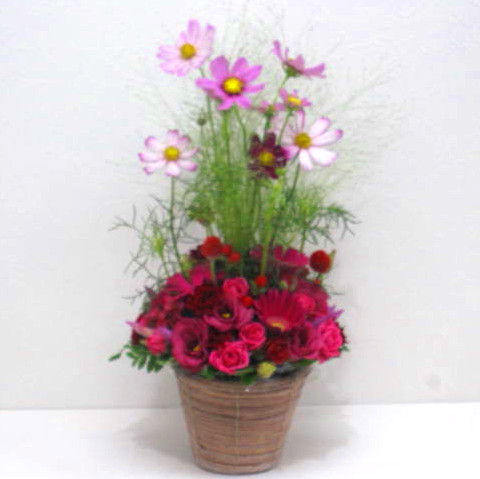 花材: メイン コスモス、リンドウ、バラ、ガーベラなど その他 葉物類など
