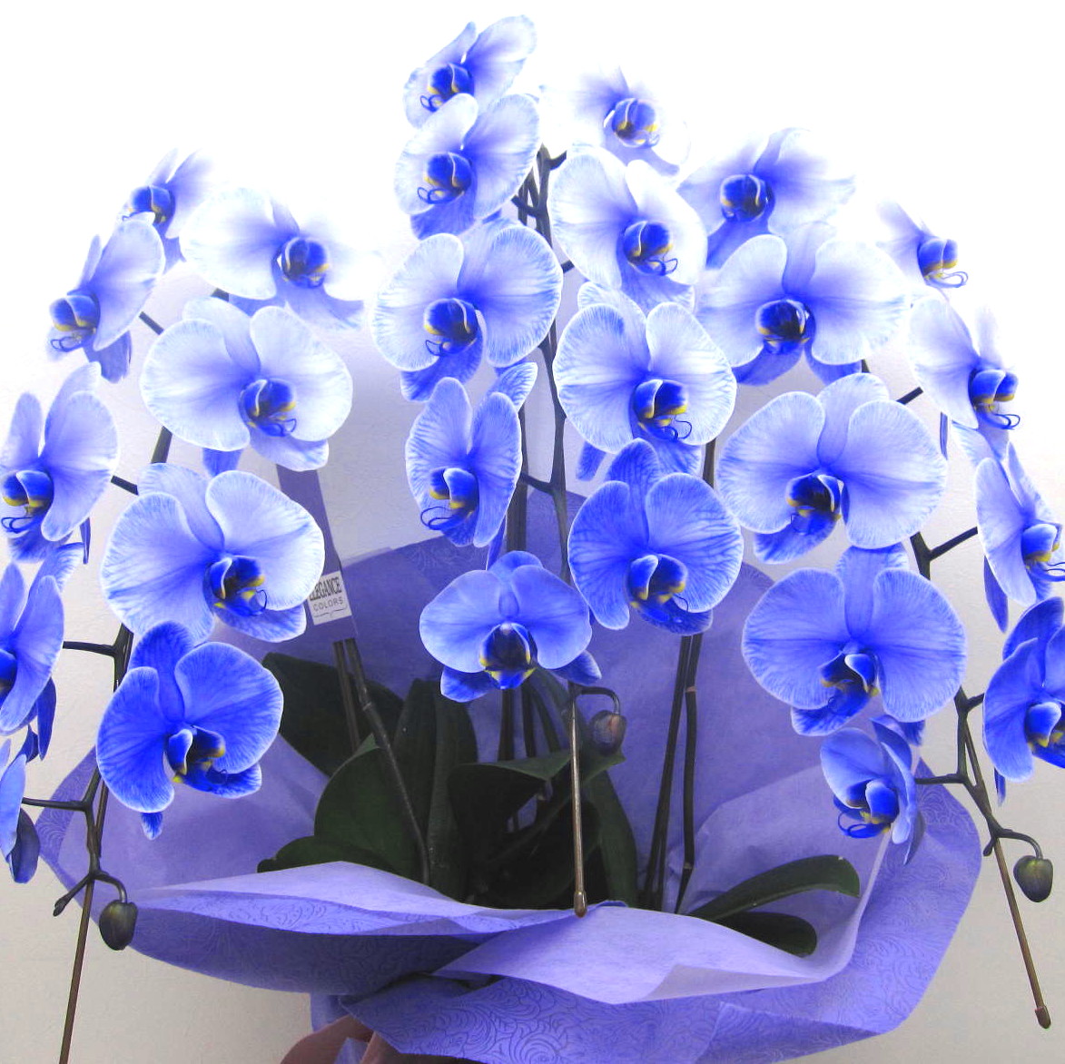 本当に珍しく希少なエレガンス胡蝶蘭。新たな技術による染色の胡蝶蘭でほとんど市場に出回ることはありません。紫色の貴賓漂う上品なイメージはきっと見たことがなく驚くことと思います。いつもとは違う胡蝶蘭のギフトにオススメです。※この他にも、ご予約注文に限り、グリーンエレガンス胡蝶蘭3本立、ブルーエレガンス胡蝶蘭3本立もできます。その際、お電話にてお問い合わせ下さい。花樹園(TEL.055-960-8739)