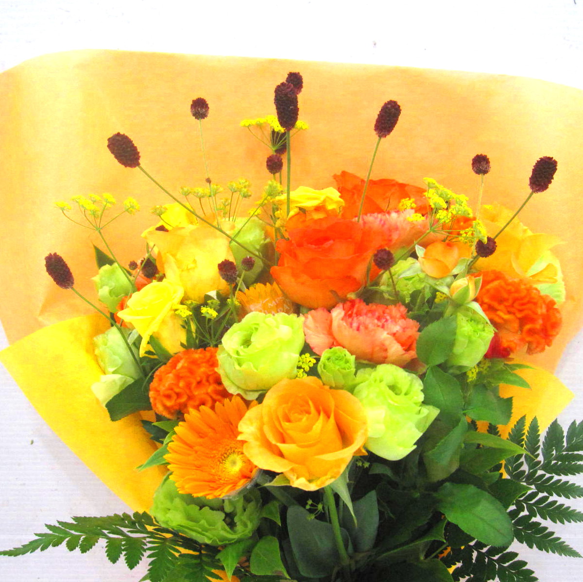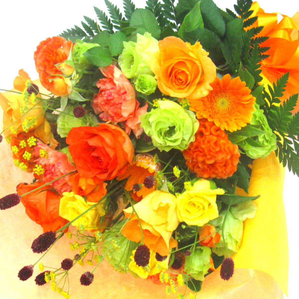 秋色の華やかな花束です。オレンジ系中心で秋のお花など季節感のあるお花と色で【秋】を演出。秋しかない秋の花、季節を感じる花束です。当店ではお客様の想いを大切に【こころを込めて】お作りいたします。静岡県長泉町から手渡しお届けまたは宅急便で全国にお届けします。是非、さまざまな贈り物に。