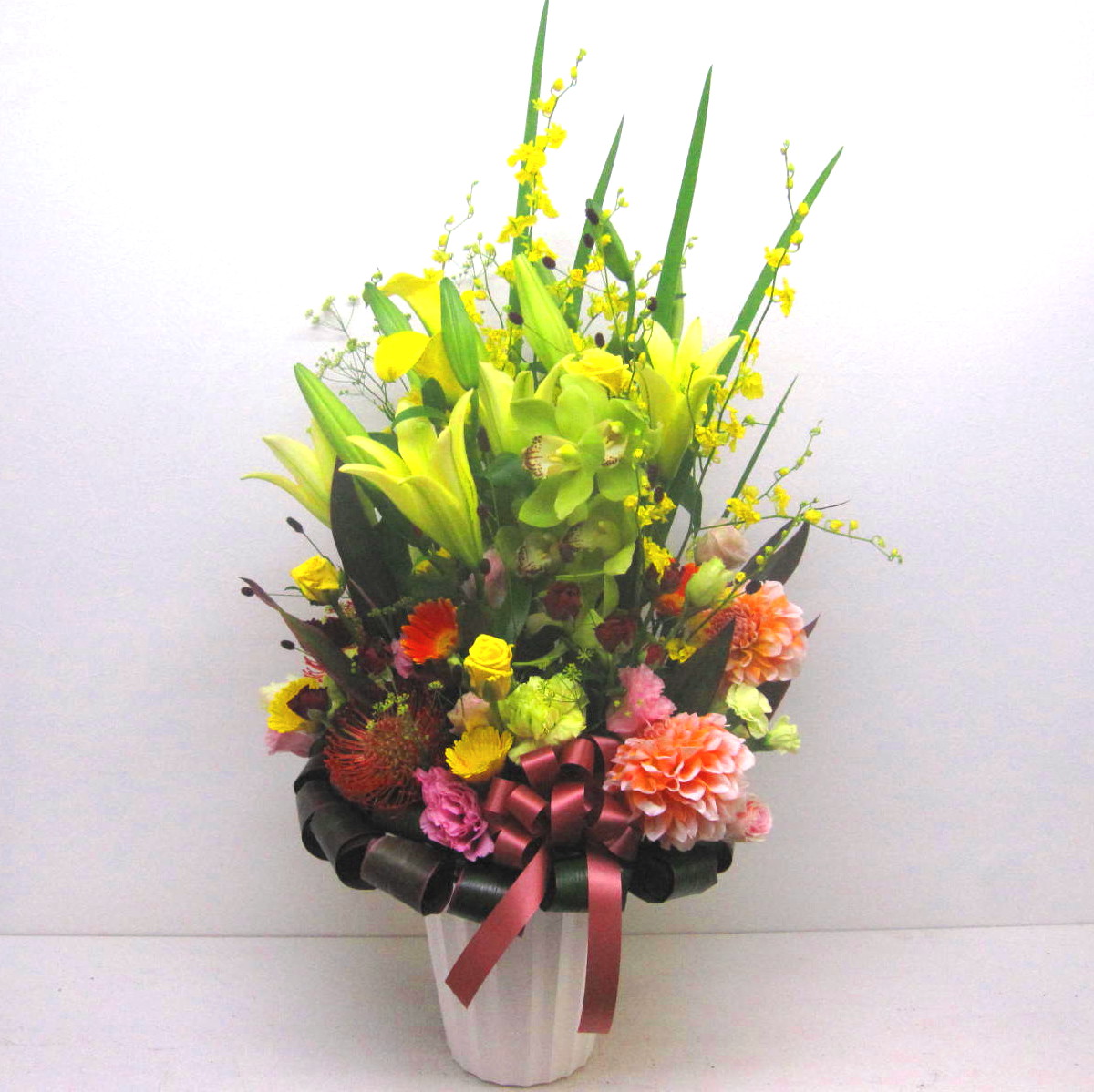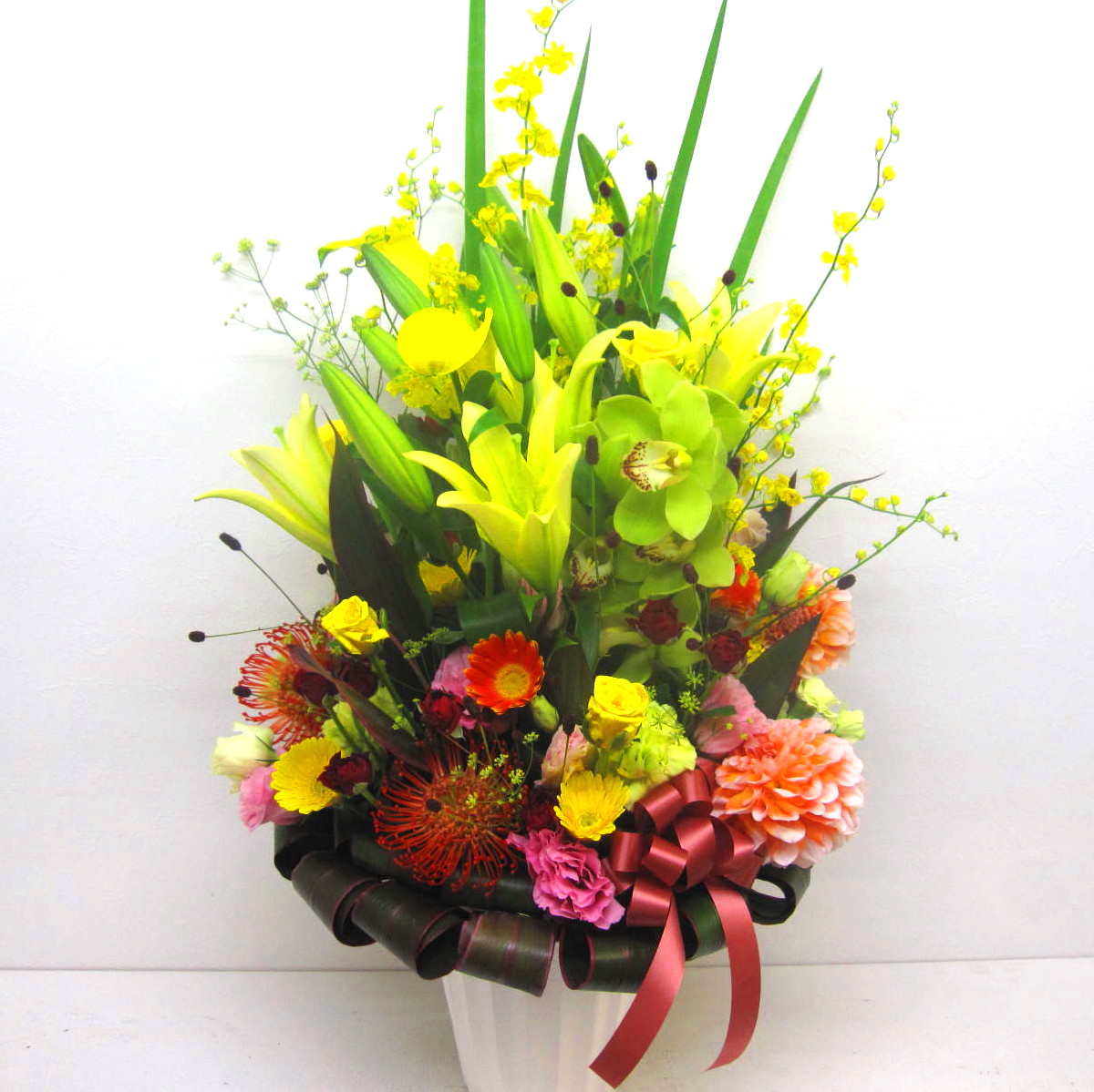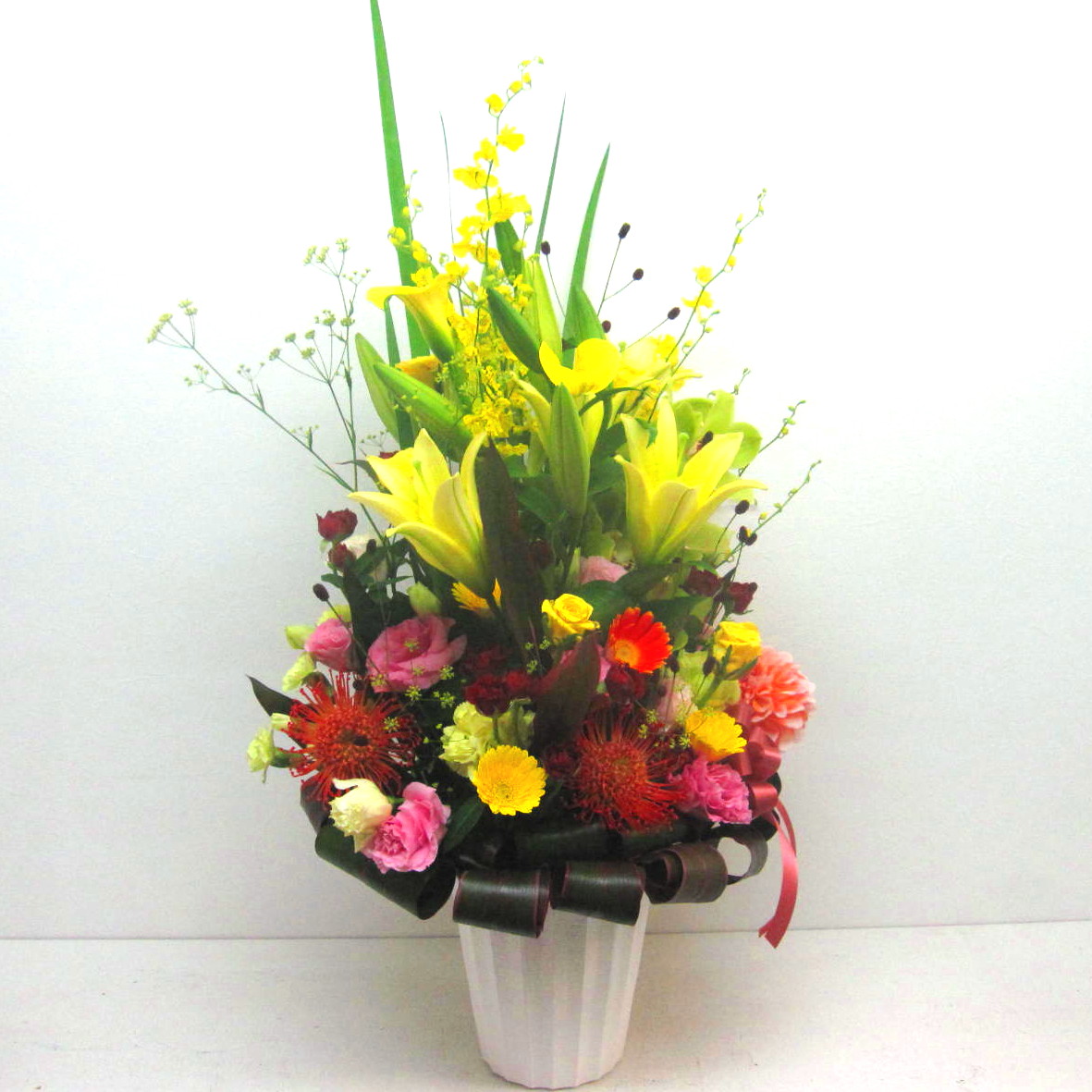 花材: メイン ユリ、リンドウ、バラ、ガーベラ、カーネーション、トルコギキョウなど その他 実物類、葉物類など