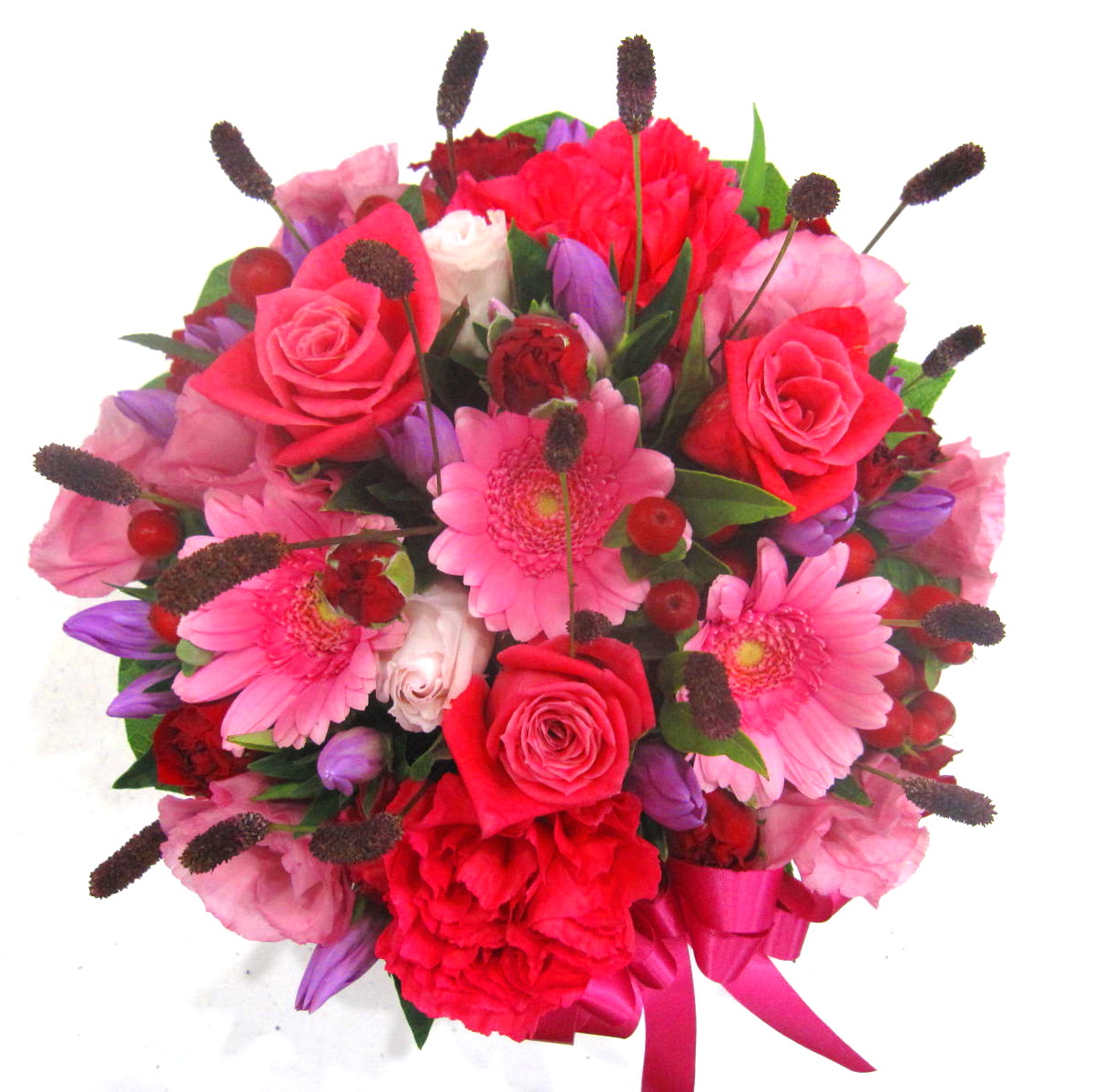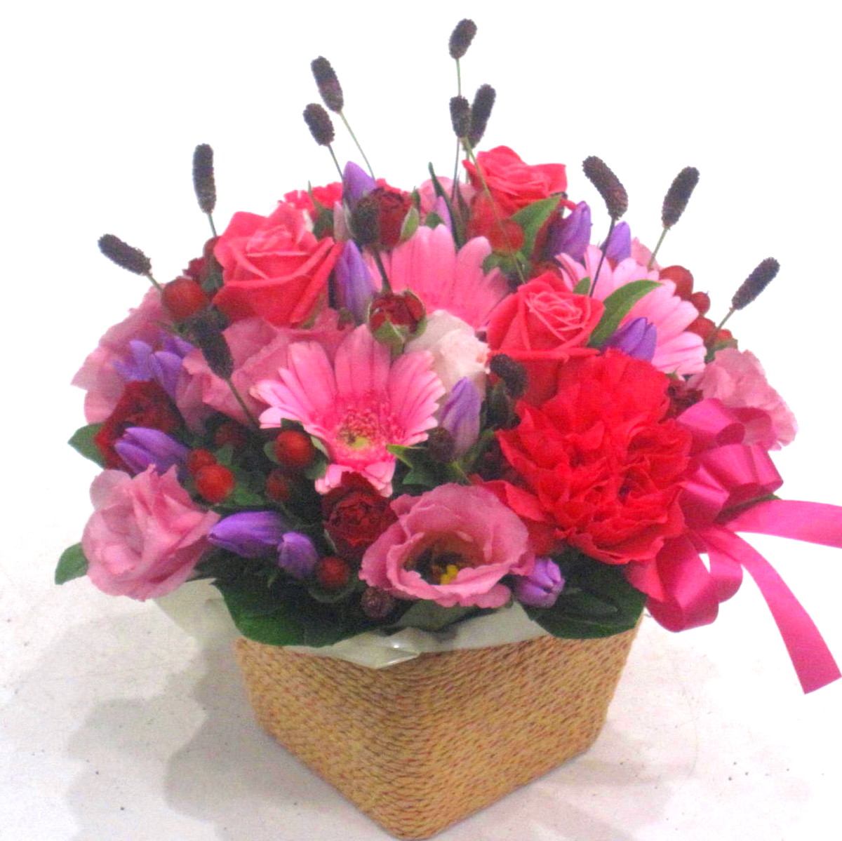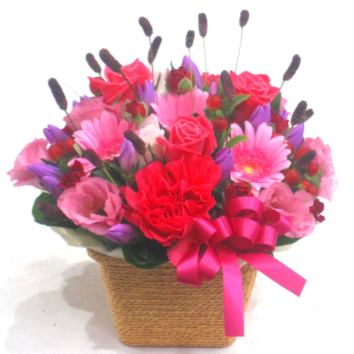 花材: メイン バラ、ガーベラ、リンドウ、ワレモコウ、トルコギキョウなど その他 実物類、葉物類など