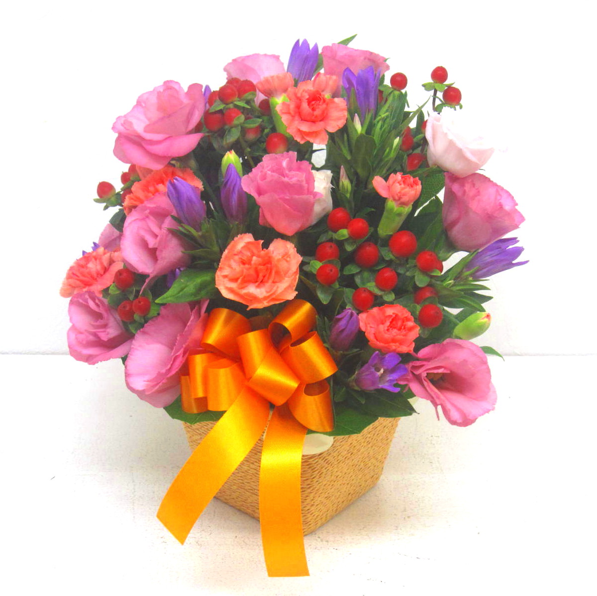 秋の明るいアレンジメント。アクセントのオレンジリボンがお花をより引き立てます。【15時迄のご注文で翌日届きます】※こちらの商品についてのご相談、ご質問等ございましたら(メール)または(お電話)にて承ります。