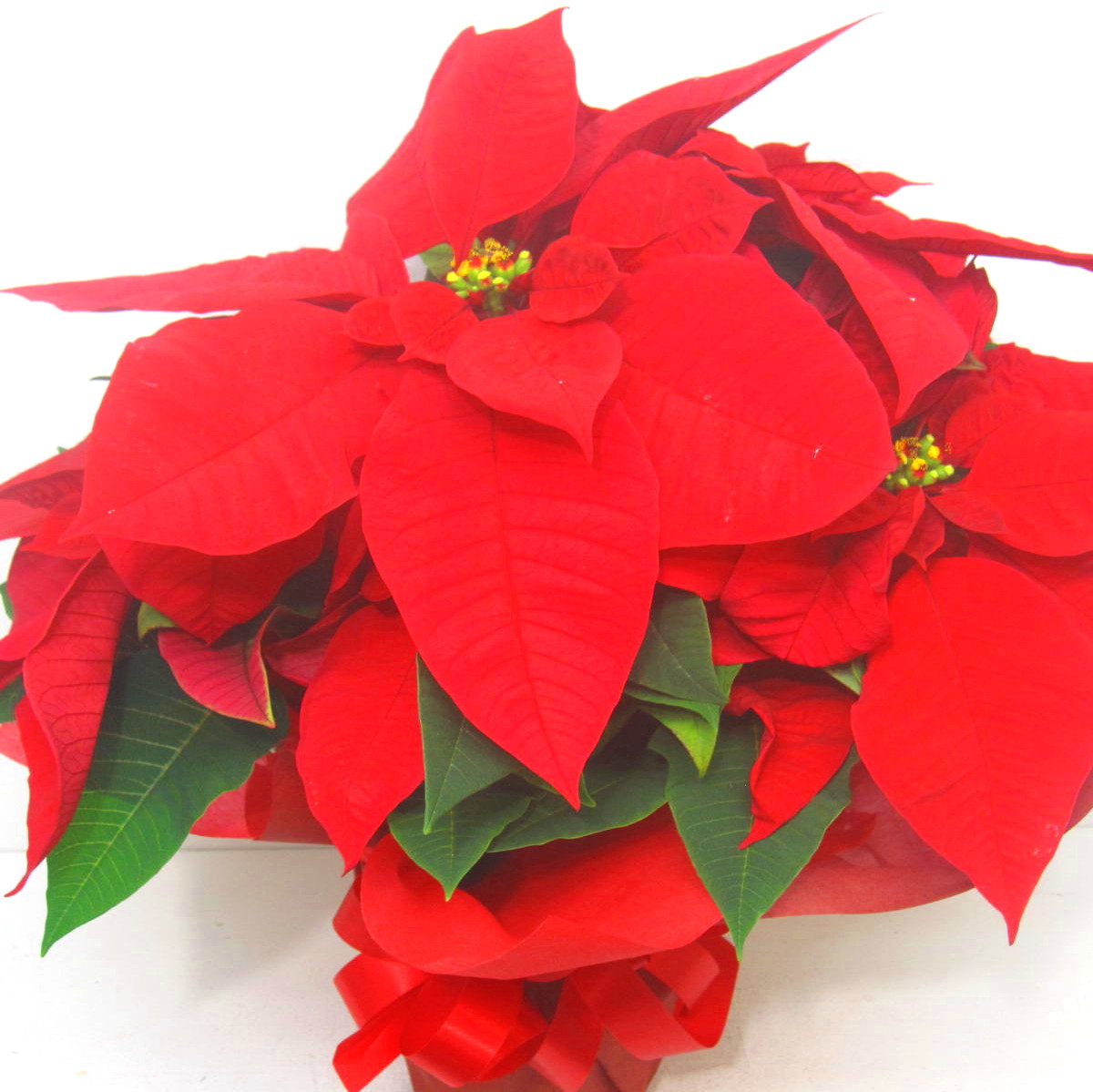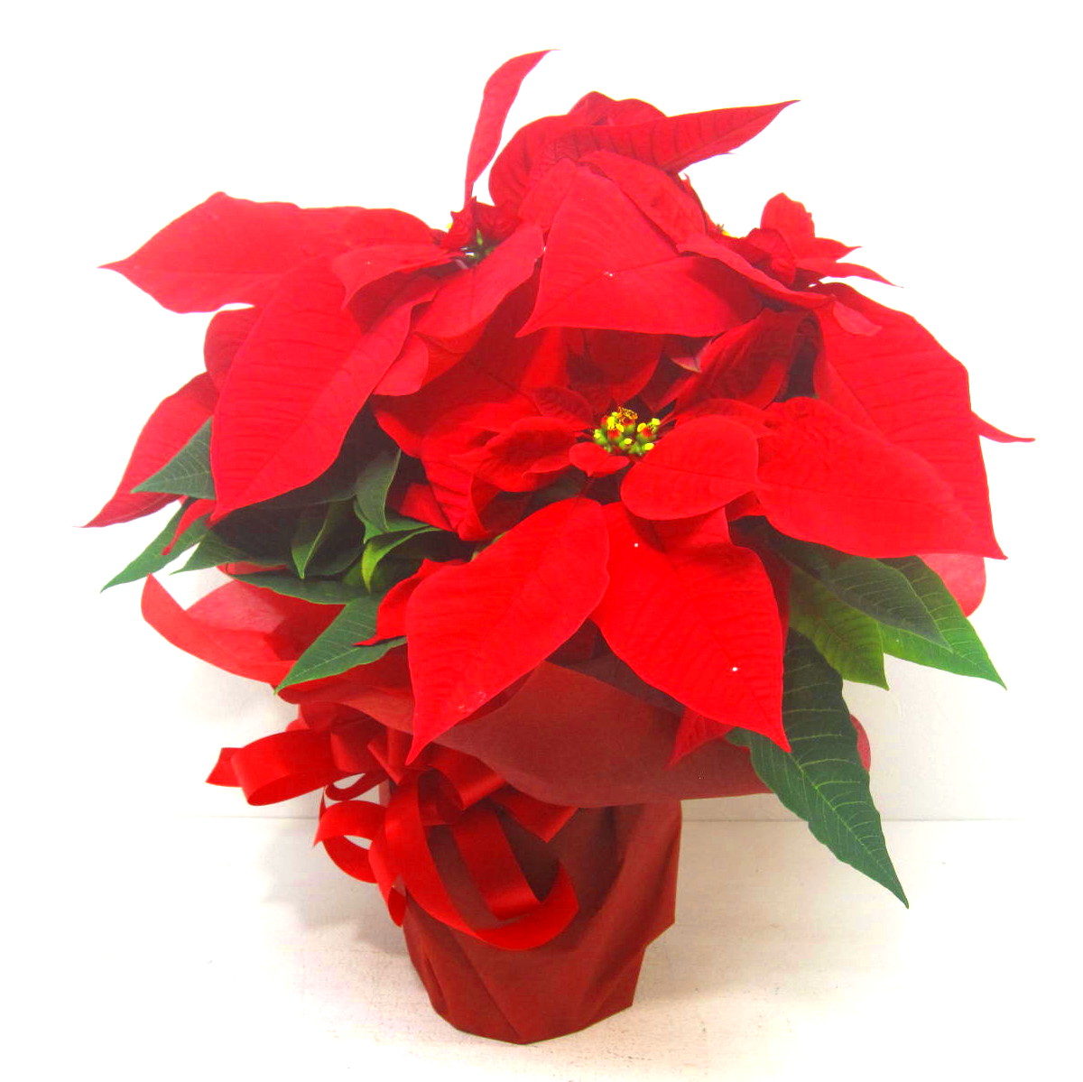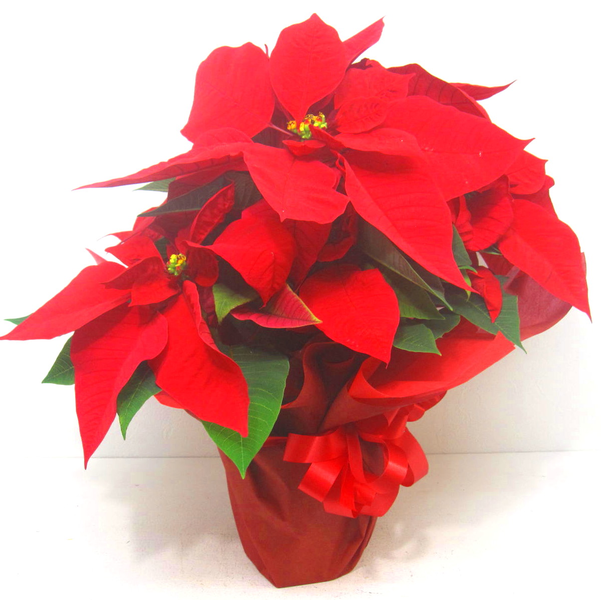 冬のギフトの定番真っ赤な【ポインセチア】です。当店オリジナルラッピングで素敵にお包みします。【15時迄のご注文で翌日届きます】※こちらの商品についてのご相談、ご質問等ございましたら(メール)または(お電話)にて承ります。