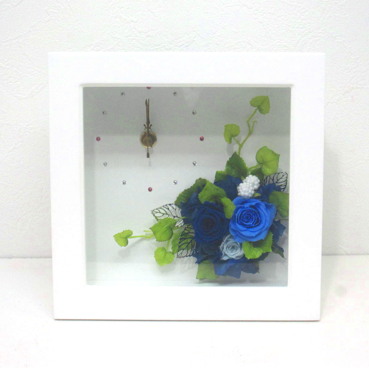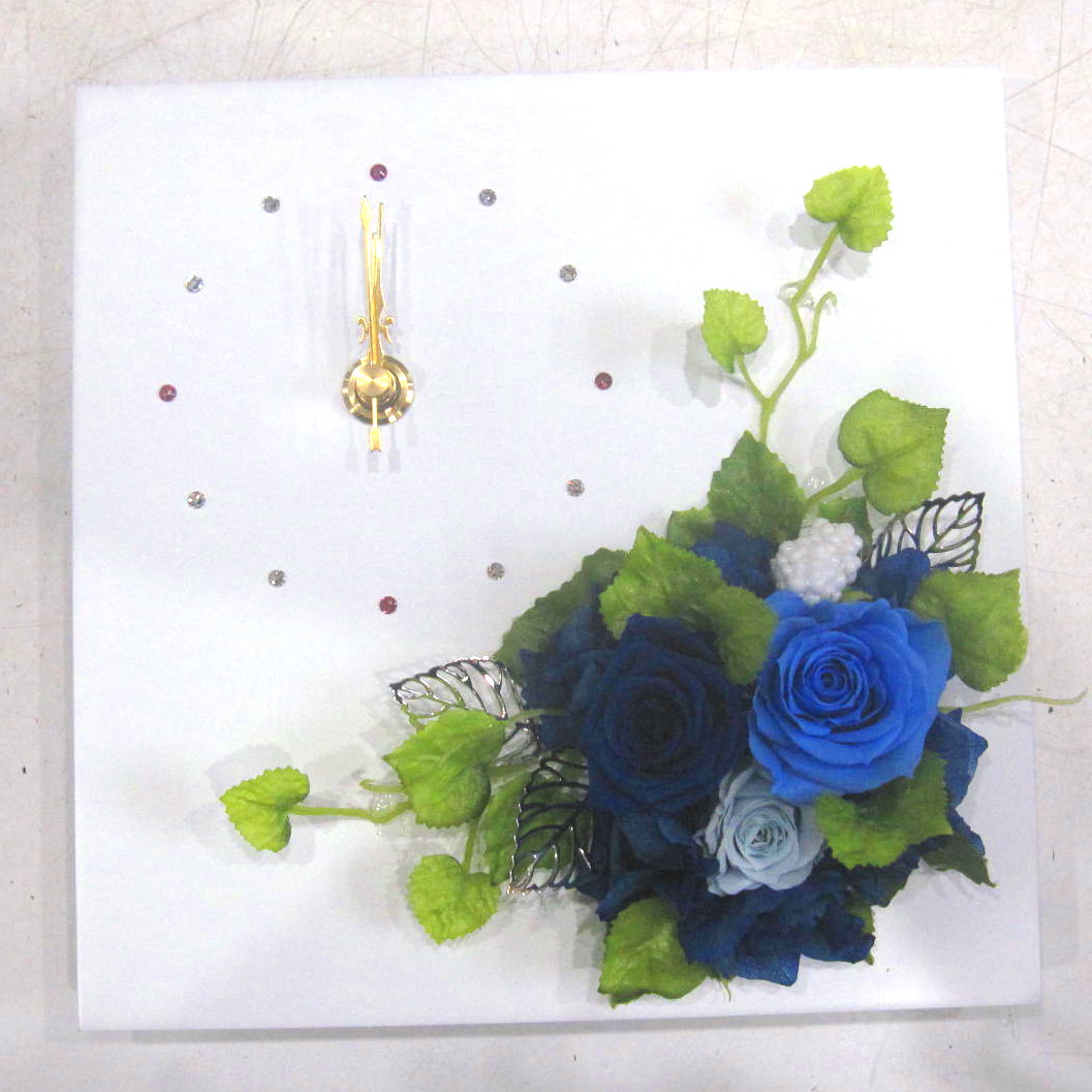 シンプルな白いスクエアフレームにスワロフスキーで模った素敵な時計にプリザーブドフラワーをアレンジしました。このまま置いて飾っても素敵ですし、壁にかけても素敵です。(電池と壁掛け用の紐も付いています)しかも1年間有効の保証書付きなので万が一の時も安心です。ラッピングも専用ギフトBOXに入れて素敵にラッピング致します。当店ではお客様の想いを大切に【こころを込めて】お作りいたします。静岡県長泉町から手渡しお届けまたは宅急便で全国にお届けします。是非、さまざまな贈り物に。