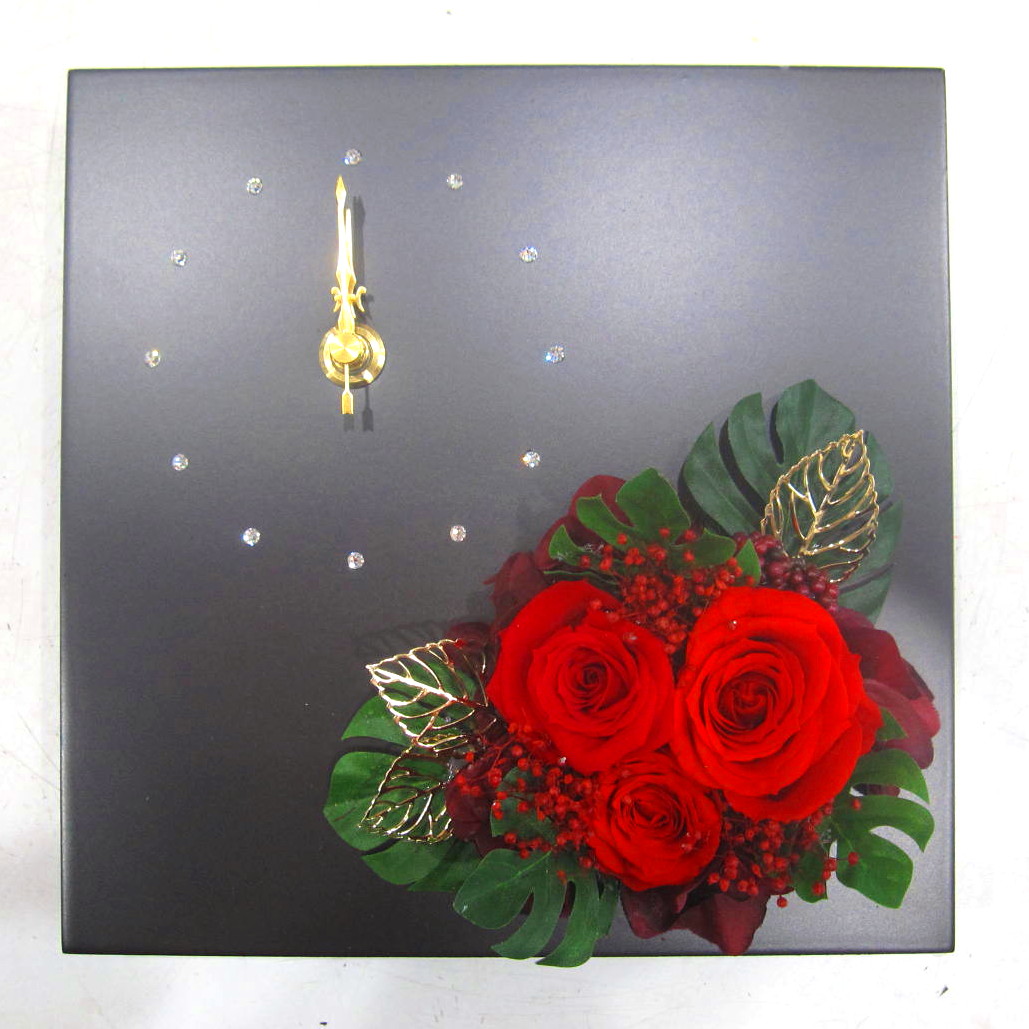 シンプルな茶色いスクエアフレームにスワロフスキーで模った素敵な時計にプリザーブドフラワーをアレンジしました。このまま置いて飾っても素敵ですし、壁にかけても素敵です。(電池と壁掛け用の紐も付いています)しかも1年間有効の保証書付きなので万が一の時も安心です。ラッピングも専用ギフトBOXに入れて素敵にラッピング致します。当店ではお客様の想いを大切に【こころを込めて】お作りいたします。静岡県長泉町から手渡しお届けまたは宅急便で全国にお届けします。是非、さまざまな贈り物に。