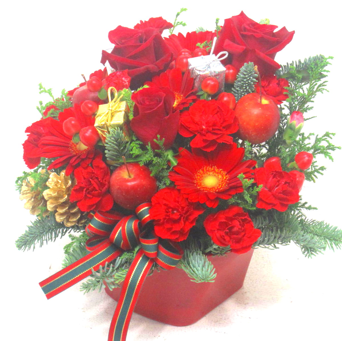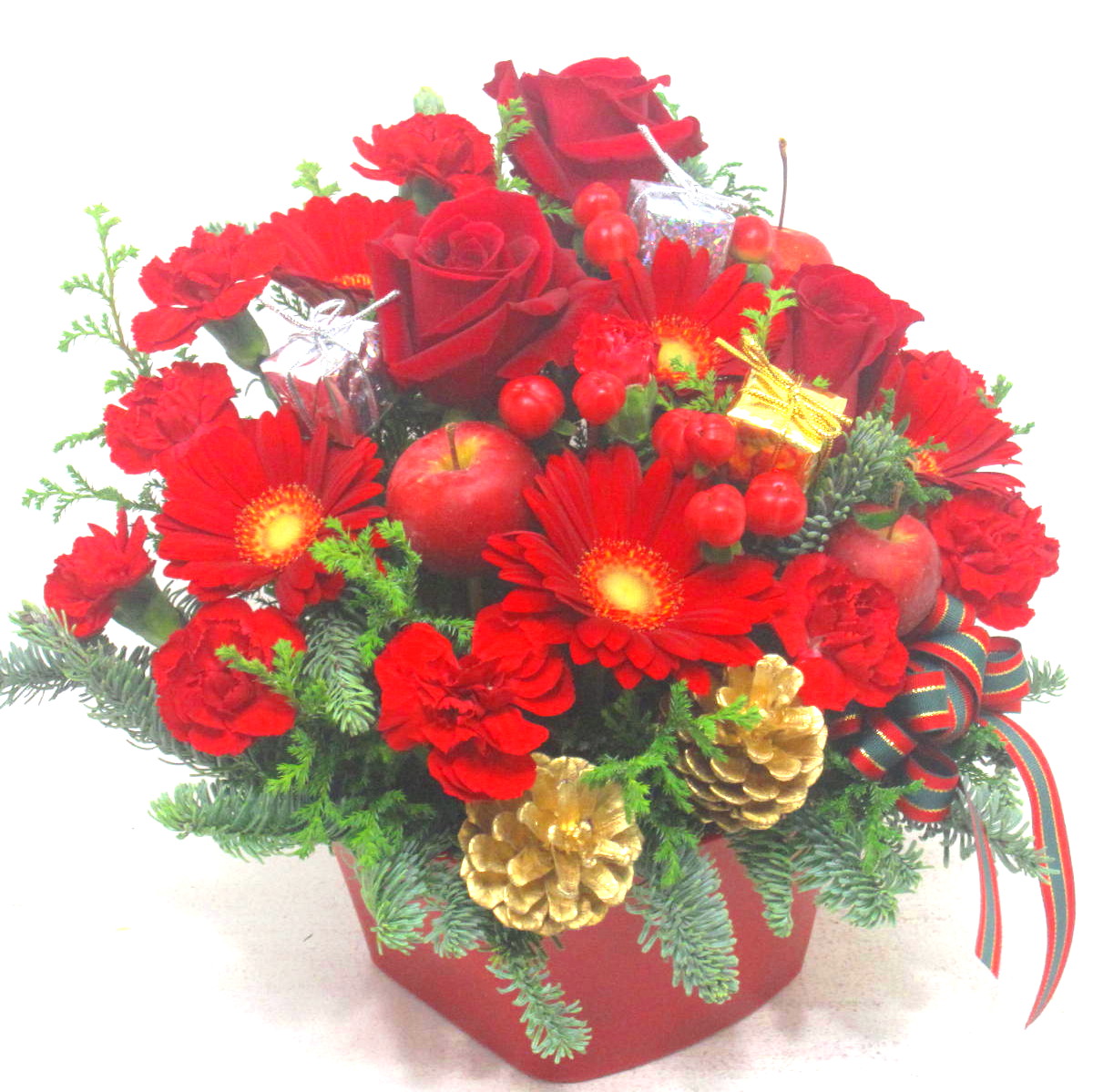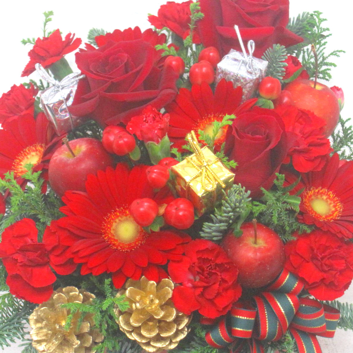 【冬の贈り物】に大人気のクリスマスアレンジメント。赤系のお花中心でモニメントなど賑やかにアレンジしました。季節限定商品です。【15時迄のご注文で翌日届きます】※こちらの商品についてのご相談、ご質問等ございましたら(メール)または(お電話)にて承ります。
