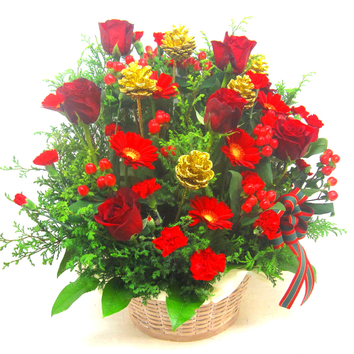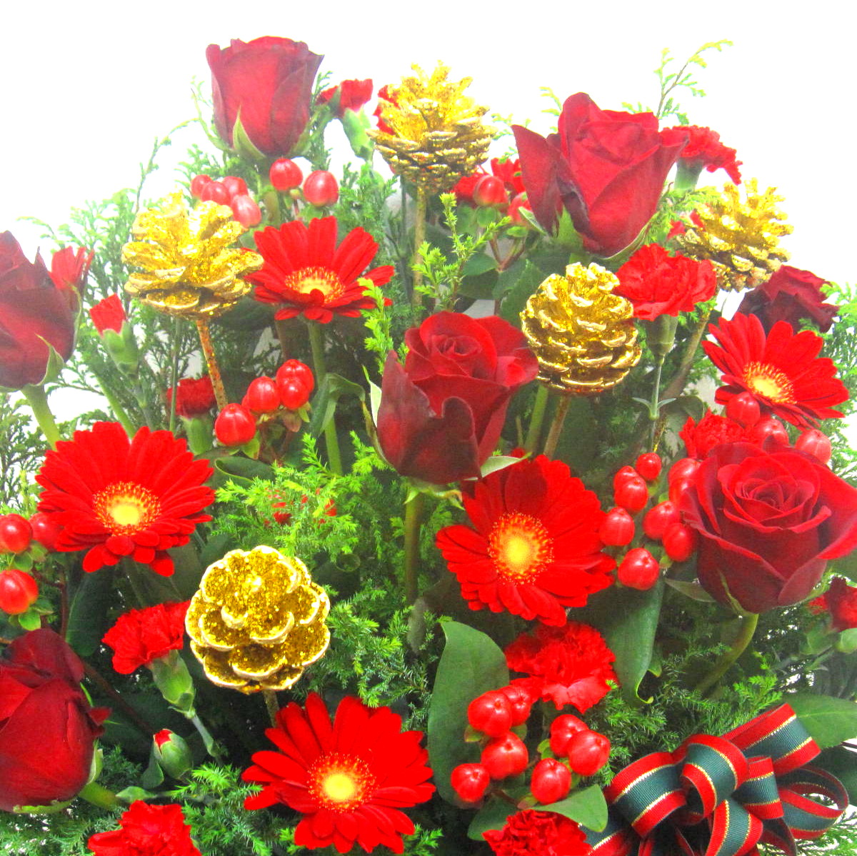 とっても華やかなクリスマスアレンジメントです。金色のラメ付き松かさと赤系のお花がクリスマスを演出します。季節限定商品です。【15時迄のご注文で翌日届きます】※こちらの商品についてのご相談、ご質問等ございましたら(メール)または(お電話)にて承ります。