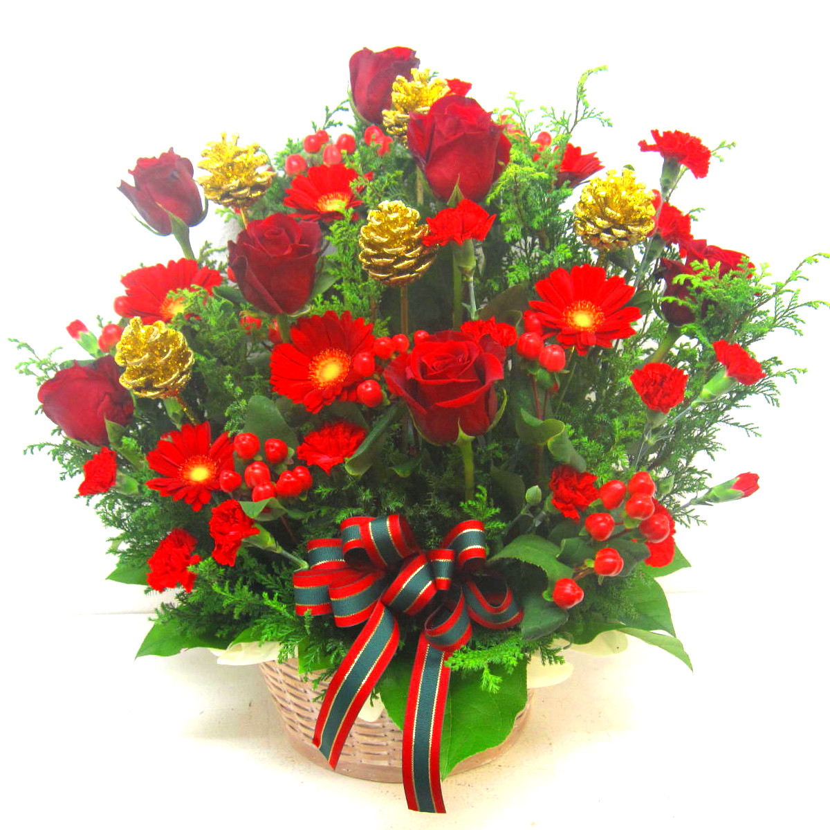 クリスマス仕様の華やかでボリューム感のあるアレンジメントです。金色のラメつきの松かさと赤系のお花がクリスマスを演出します。当店ではお客様の想いを大切に【こころを込めて】お作りいたします。静岡県長泉町から手渡しお届けまたは宅急便で全国にお届けします。是非、さまざまな贈り物に。