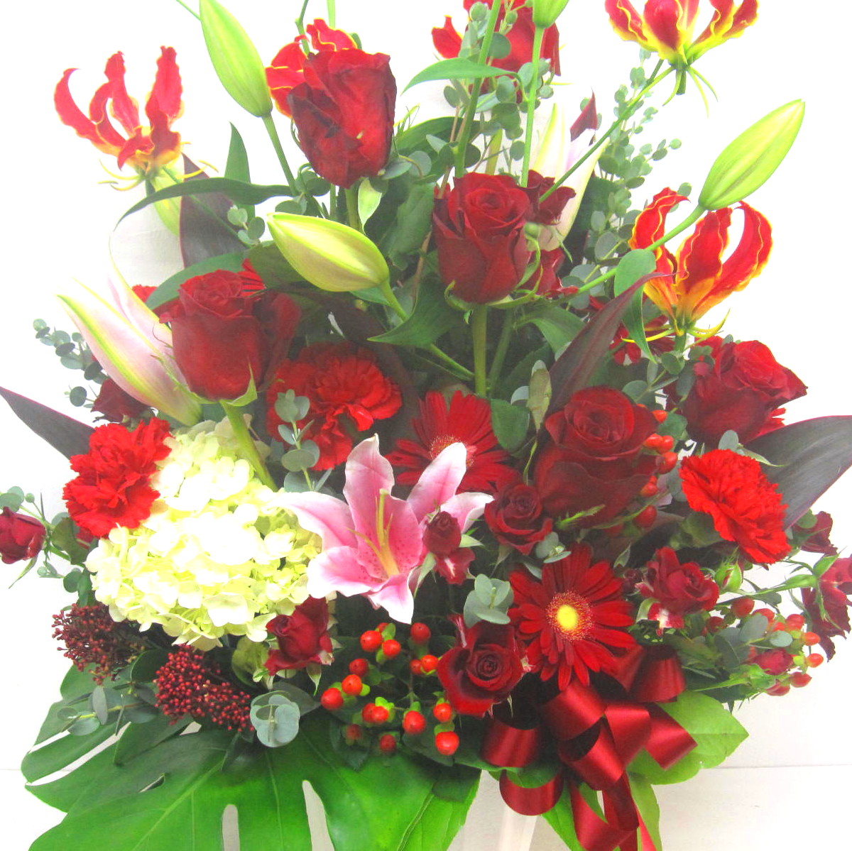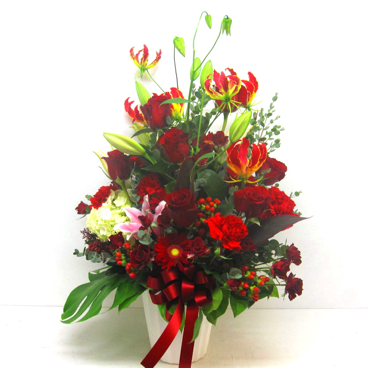 花材: メイン ユリ、バラ、ガーベラ、カーネーションなど その他 実物類、葉物類など