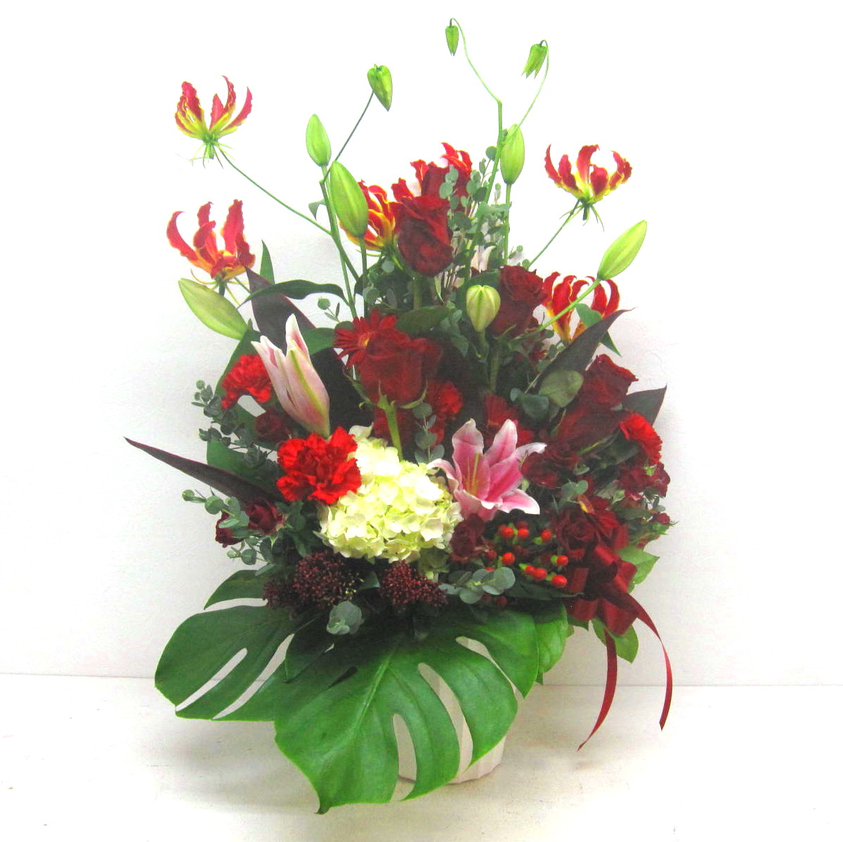 赤バラを入れた赤系のボリューム感のあるアレンジメントです。※こちらの商品についてのご相談、ご質問等ございましたら(メール)または(お電話)にて承ります。