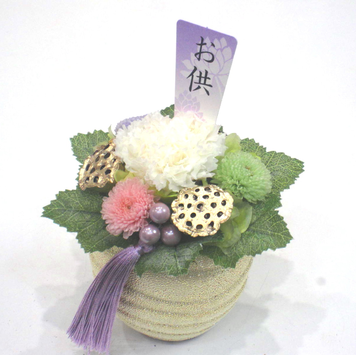 お供え専用のプリザーブドフラワーです。控えめのゴールドの花器が供花全体を上品にまとめたアレンジです。毎日の供養に、法事やお盆の際の贈り物として、また喪中はがきを受け取った際にたむけるお悔やみの品として、故人を偲ぶ様々なシーンでお使い頂けます。当店では心を込めてお作りし手渡しお届けまたは宅急便で全国へお届けします。是非、さまざまな贈り物に。