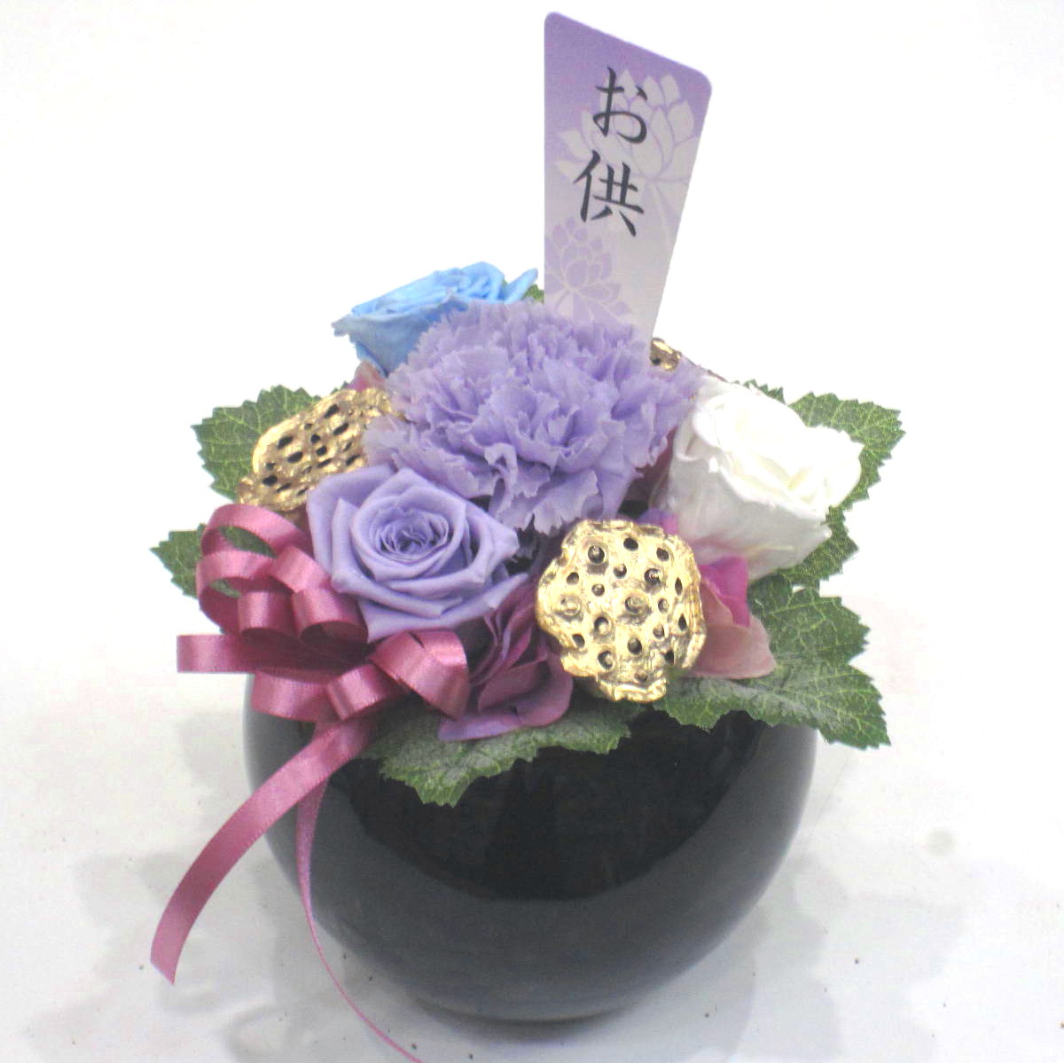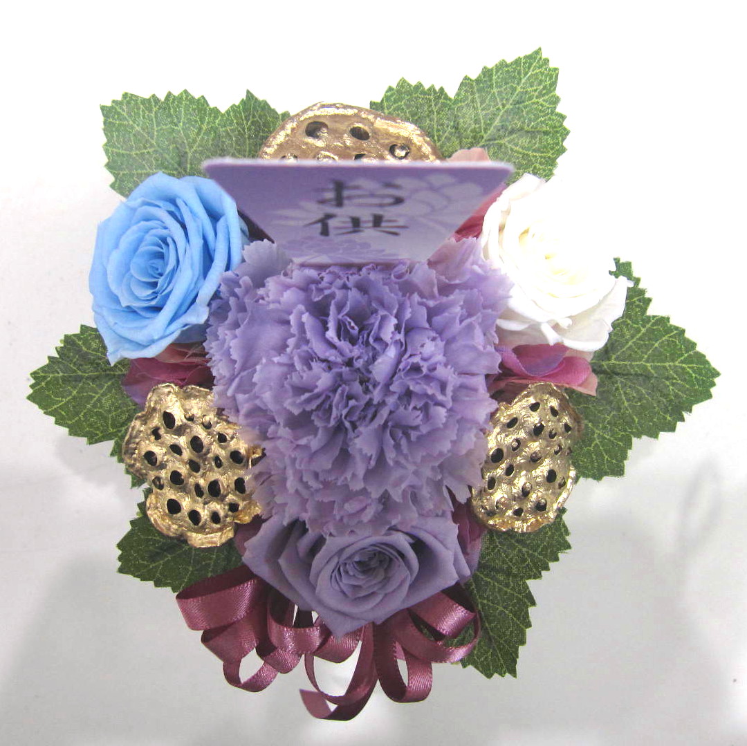 お供え専用のプリザーブドフラワーです。毎日の供養に、法事やお盆の際の贈り物として、また喪中はがきを受け取った際にたむけるお悔やみの品として、故人を偲ぶ様々なシーンでお使い頂けます。当店では心を込めてお作りし手渡しお届けまたは宅急便で全国へお届けします。是非、さまざまな贈り物に。