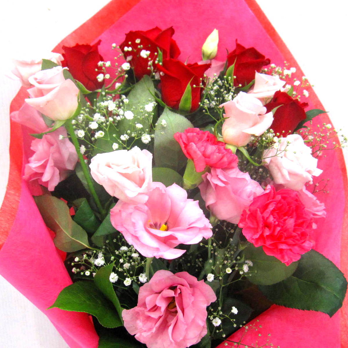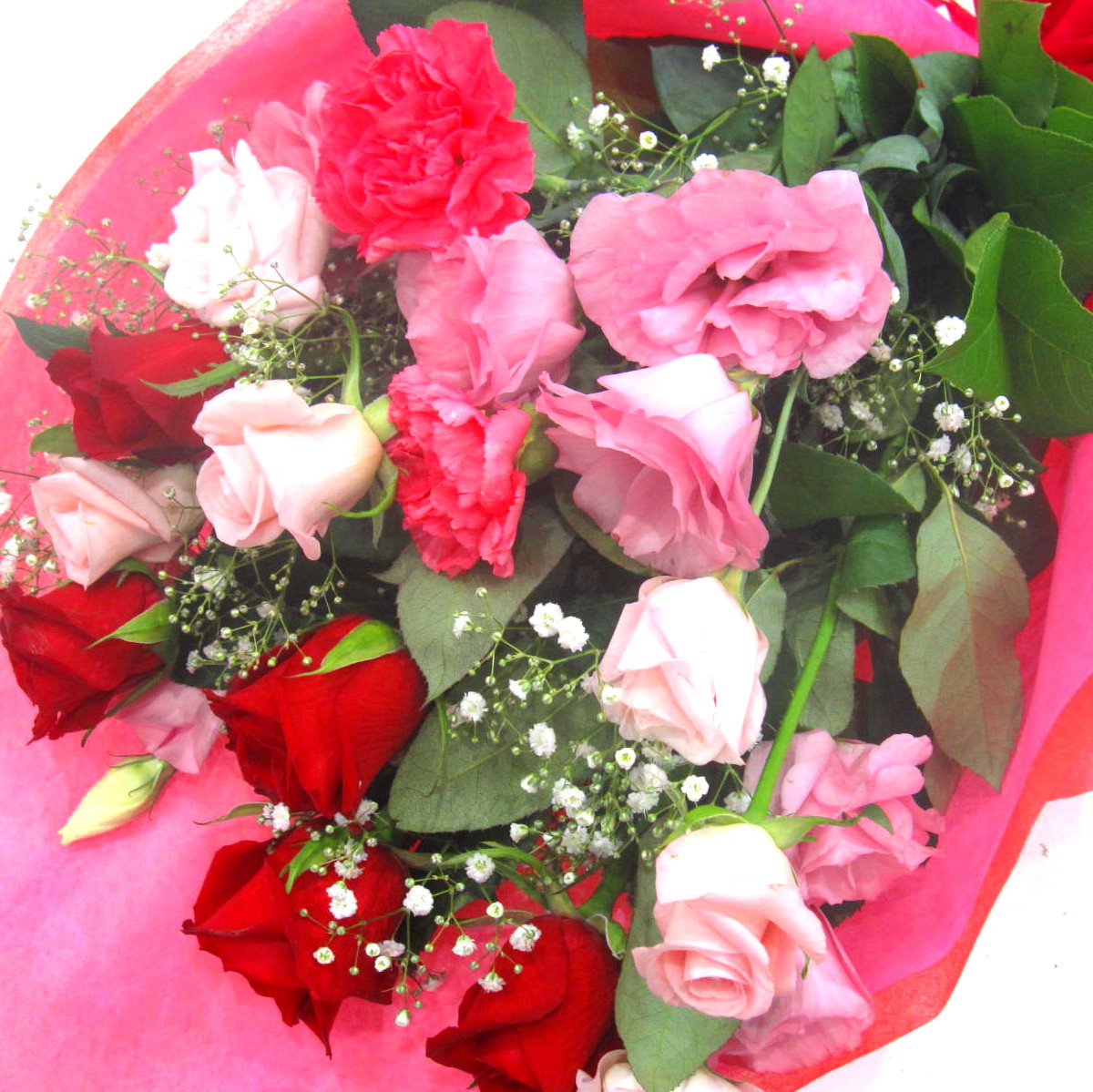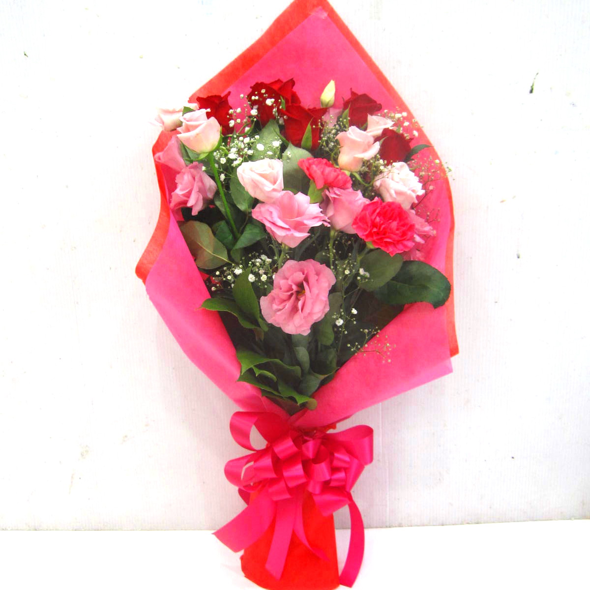 赤いバラや、トルコギキョウ、カスミソウなどを入れたボリューム感のある華やかな花束。お誕生日や記念日、歓送迎やさまざまな御祝ごとに季節を問わず人気の花束です。当店ではお客様の想い大切に【こころを込めて】お作りいたします。静岡県長泉町から手渡しお届けまたは宅急便で全国にお届けします。是非、さまざまな贈り物に。