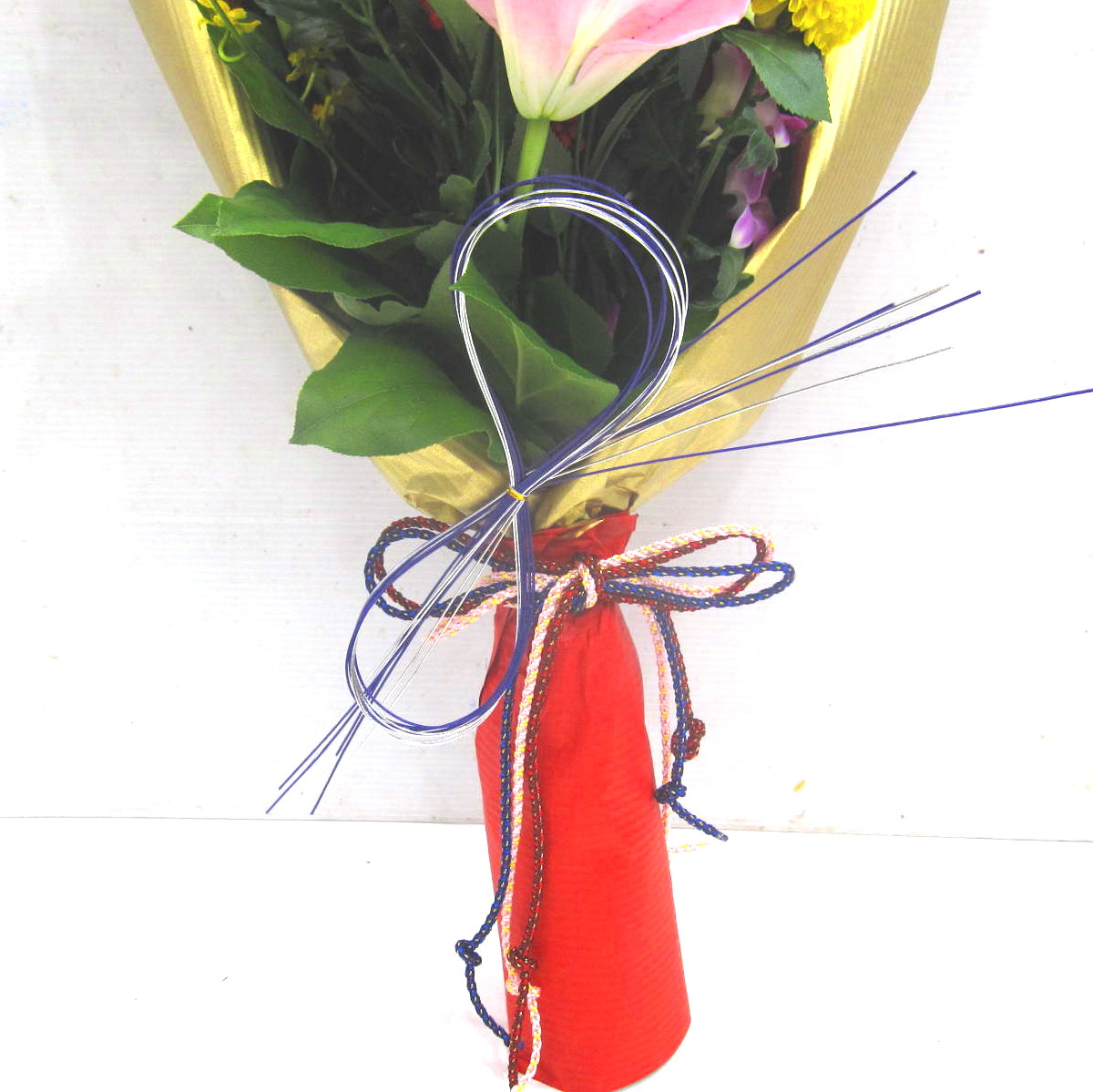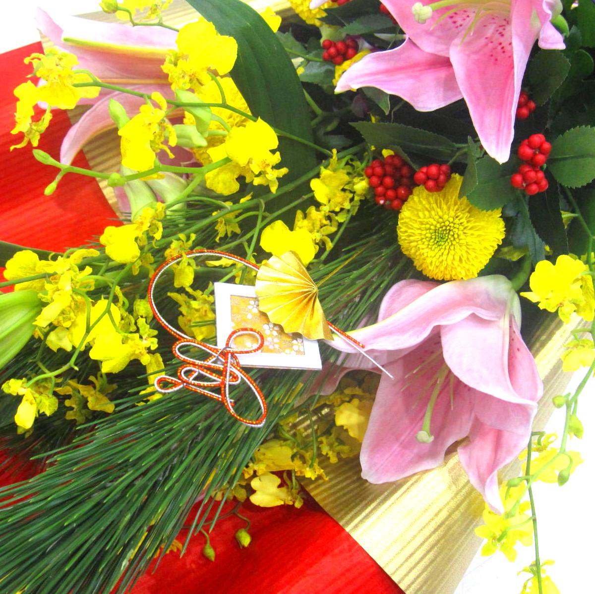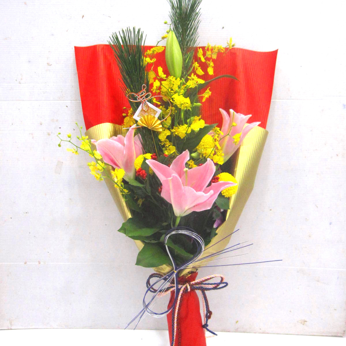 資材・ラッピング: 和紙ダブル、リボン、迎春ピック、フラワーケアカード(取扱説明書)