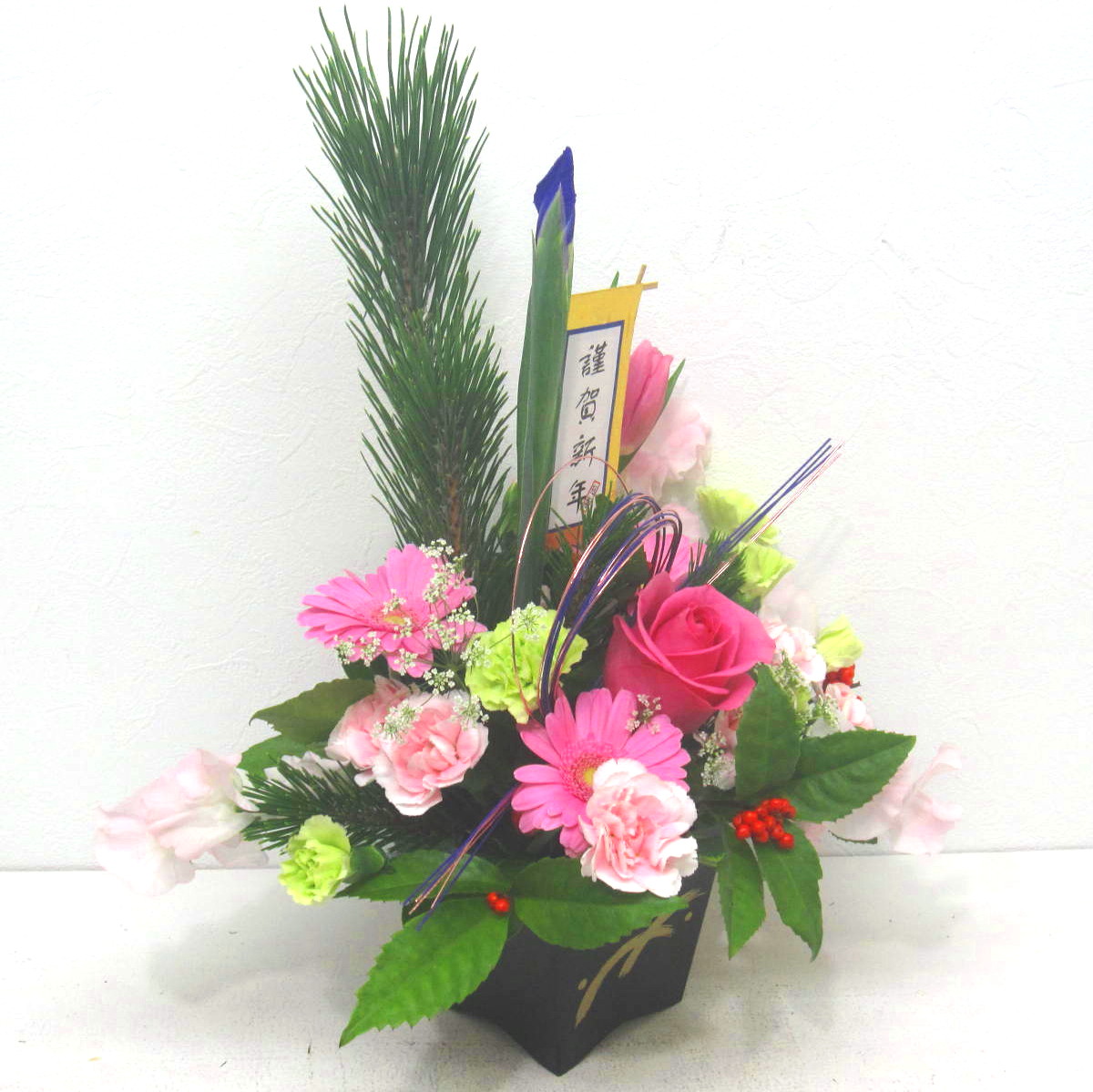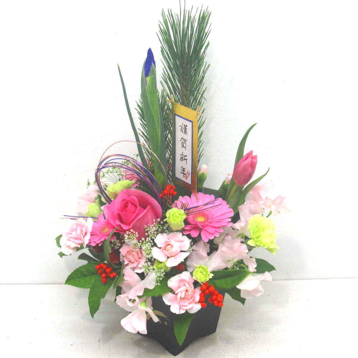 資材・ラッピング: お正月スクエアプラコンポート、お正月ピック、吸水性スポンジ、フラワーケアカード(取扱説明書)