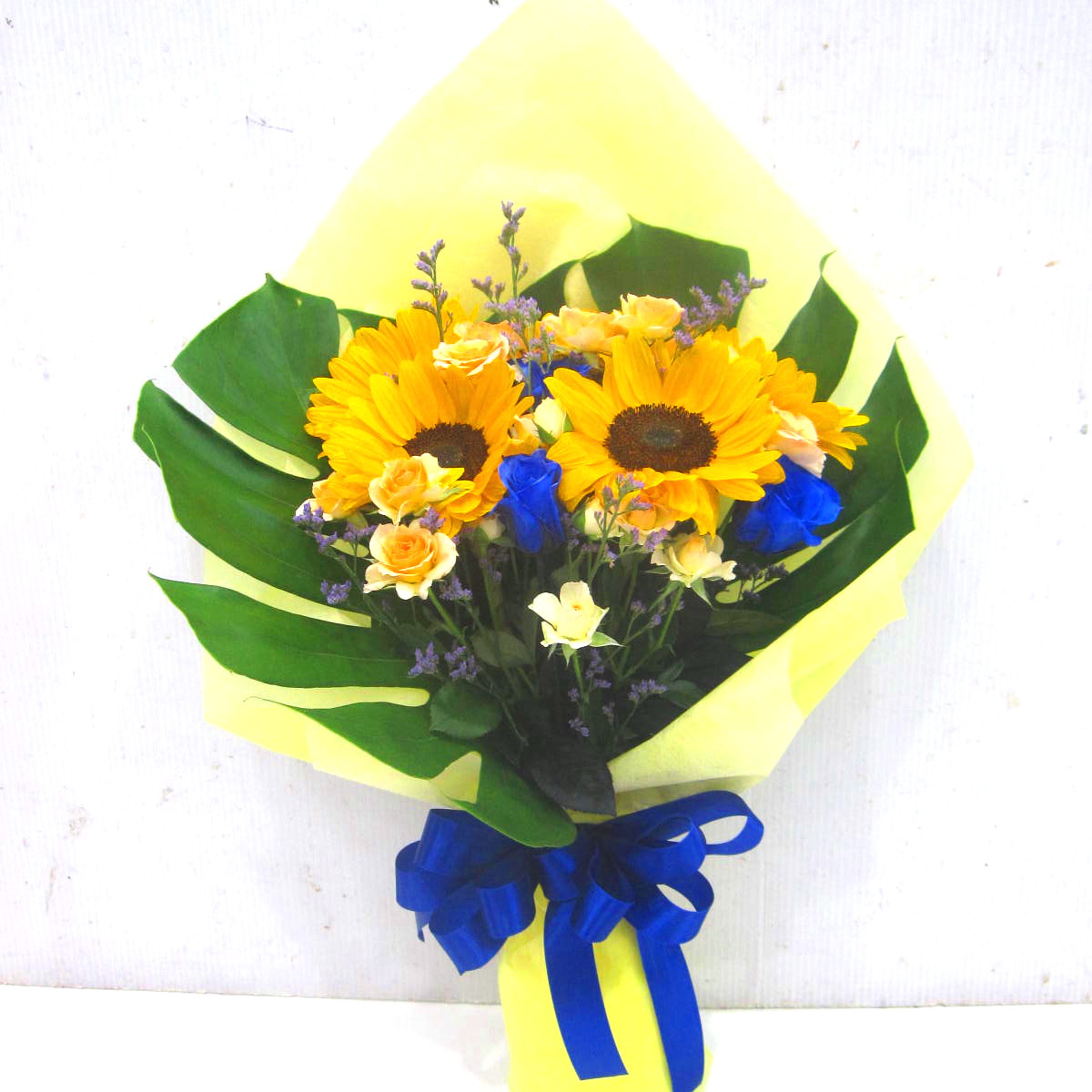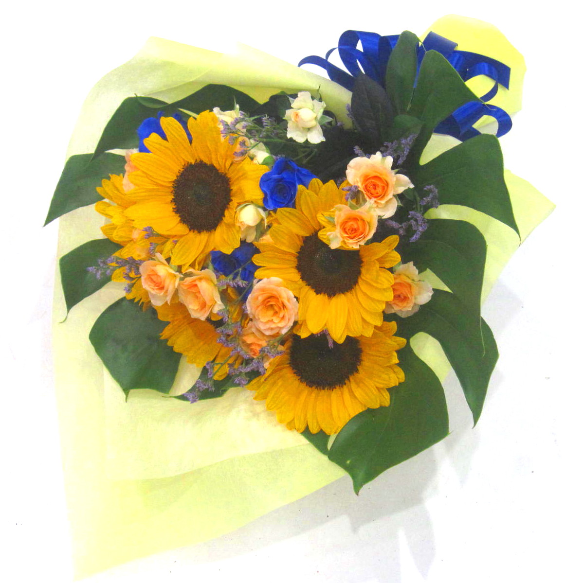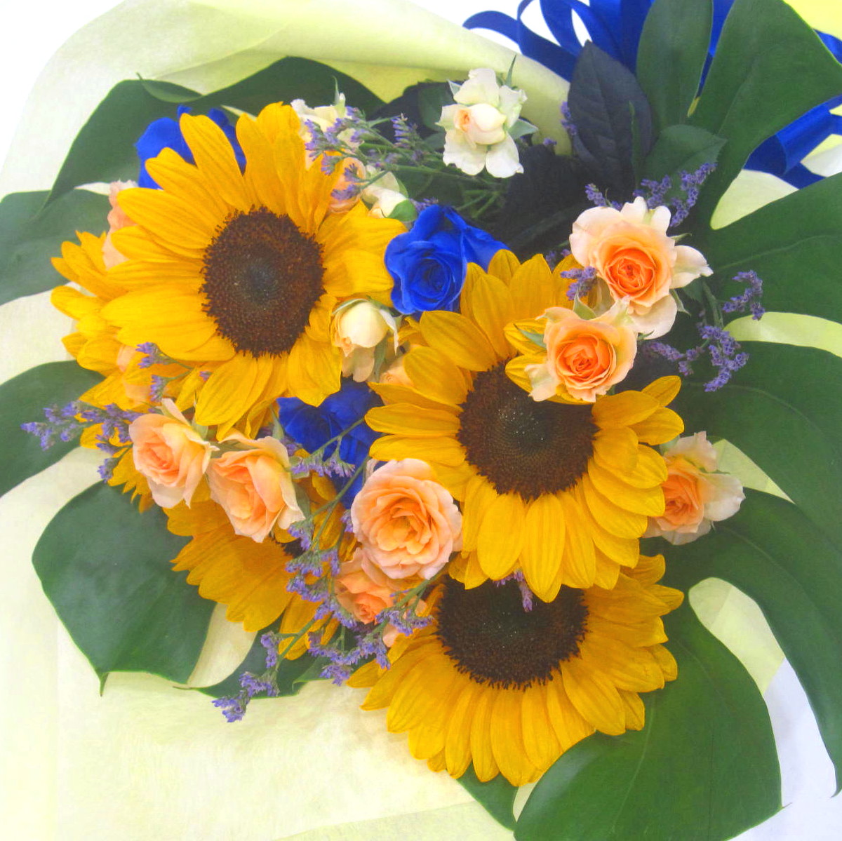季節を感じさせる黄色&ブルー系の花束です。季節のヒマワリのお花を入れてボリューム感があり、個性的な雰囲気にお作りします。貰って嬉しい贈り物でとても喜んでいたただけると思います。当店ではお客様の想い大切に【こころを込めて】お作りいたします。静岡県駿東郡長泉町から日本全国へお届けします。是非、想いを込めたフラワーギフトにいかがですか!?