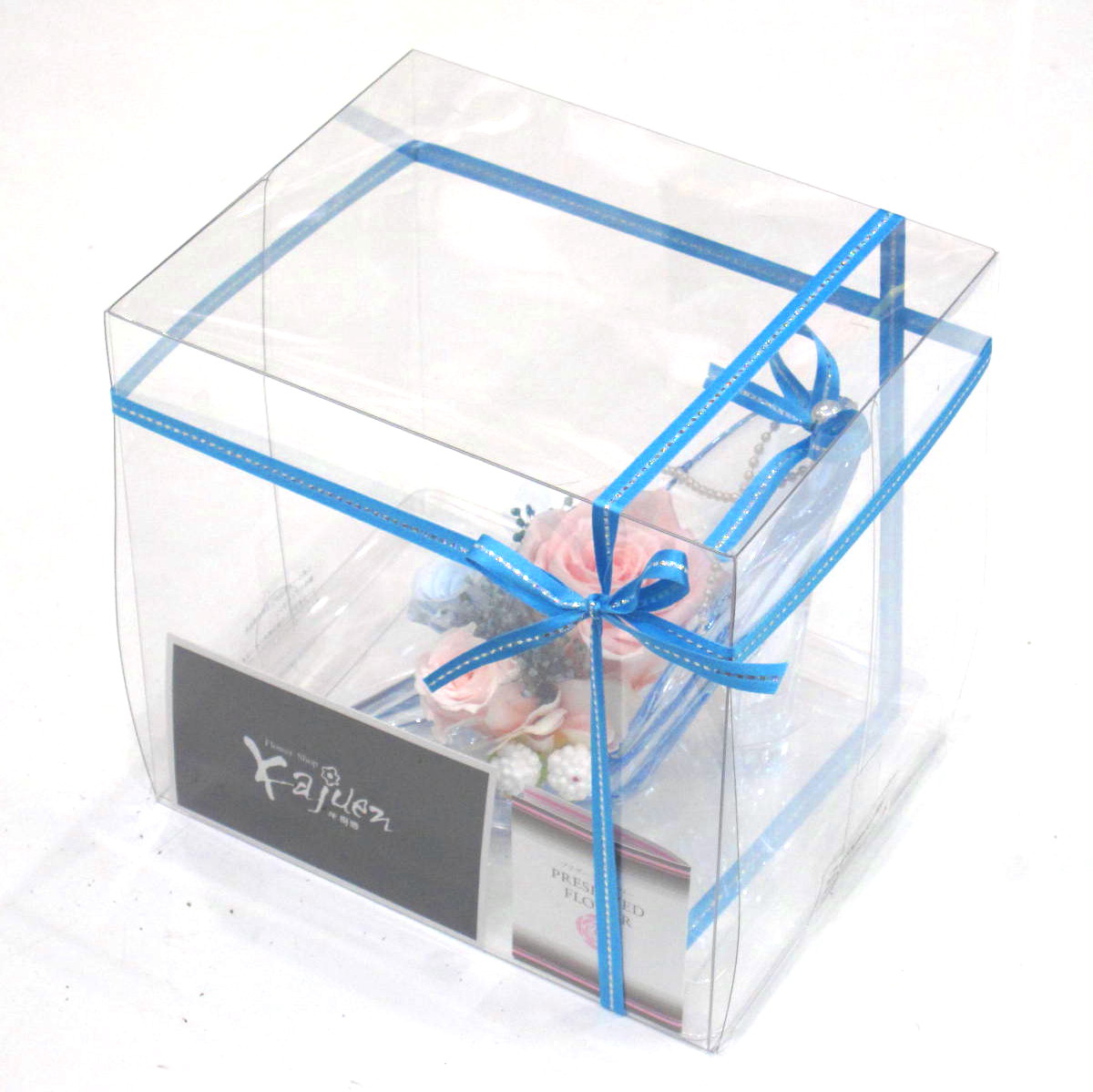 資材・ラッピング: アクリルハイヒール(クリアブルー)、リボン、ギフト用クリアケース付き、コミュニケーションカード(取扱説明書)