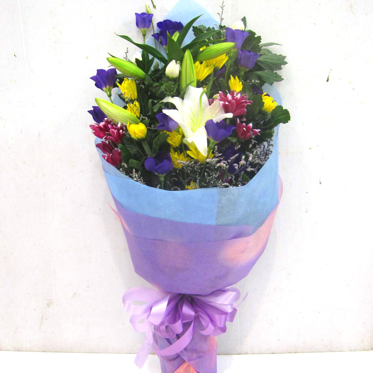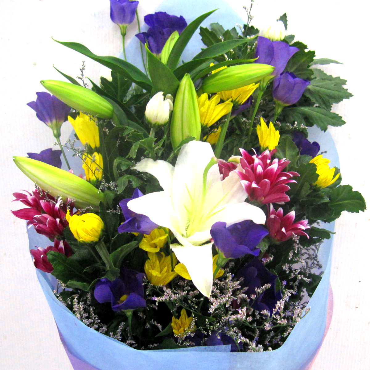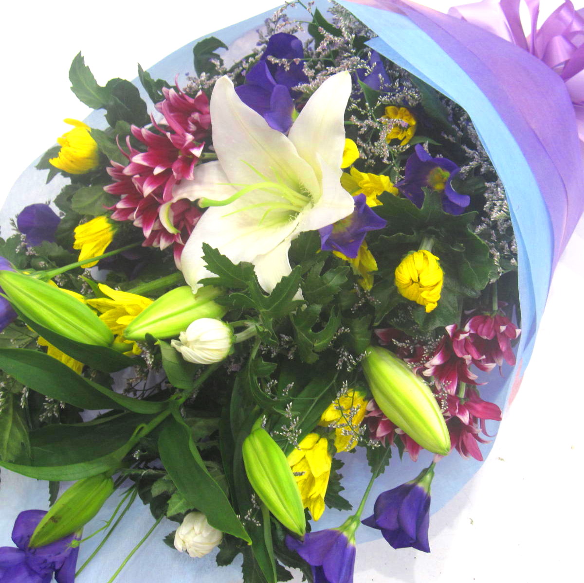 ユリやキクなど持ちの良いお花を入れた少し明るい花束です。いつも明るかった故人を思い出し静かに偲びます。【15時迄のご注文で翌日届きます】※こちらの商品についてのご相談、ご質問等ございましたら(メール)または(お電話)にて承ります。
