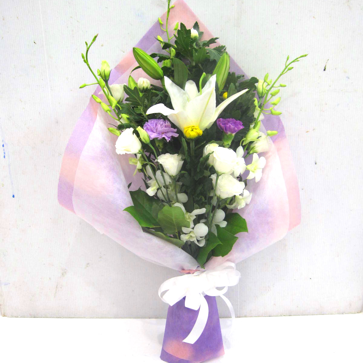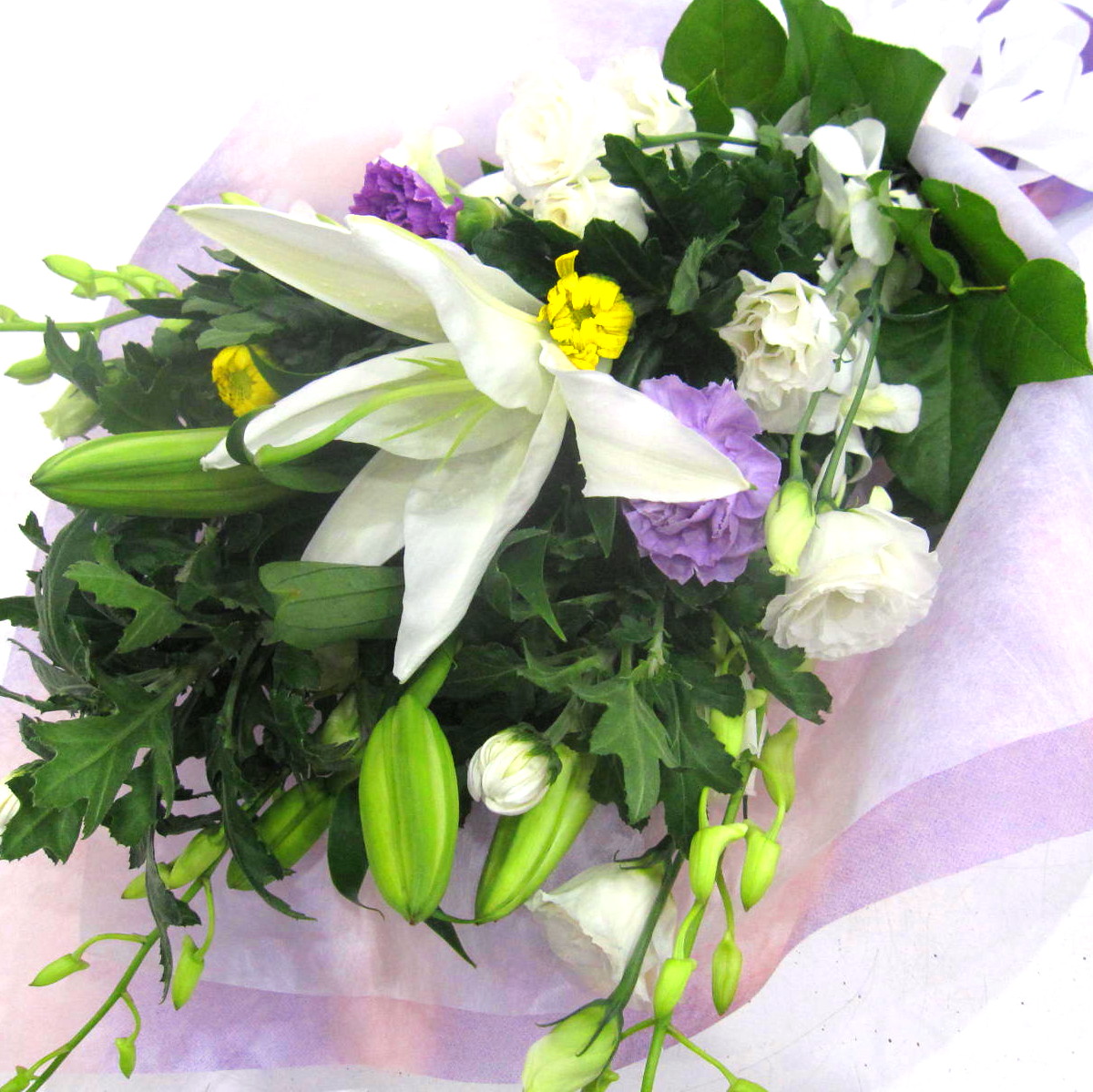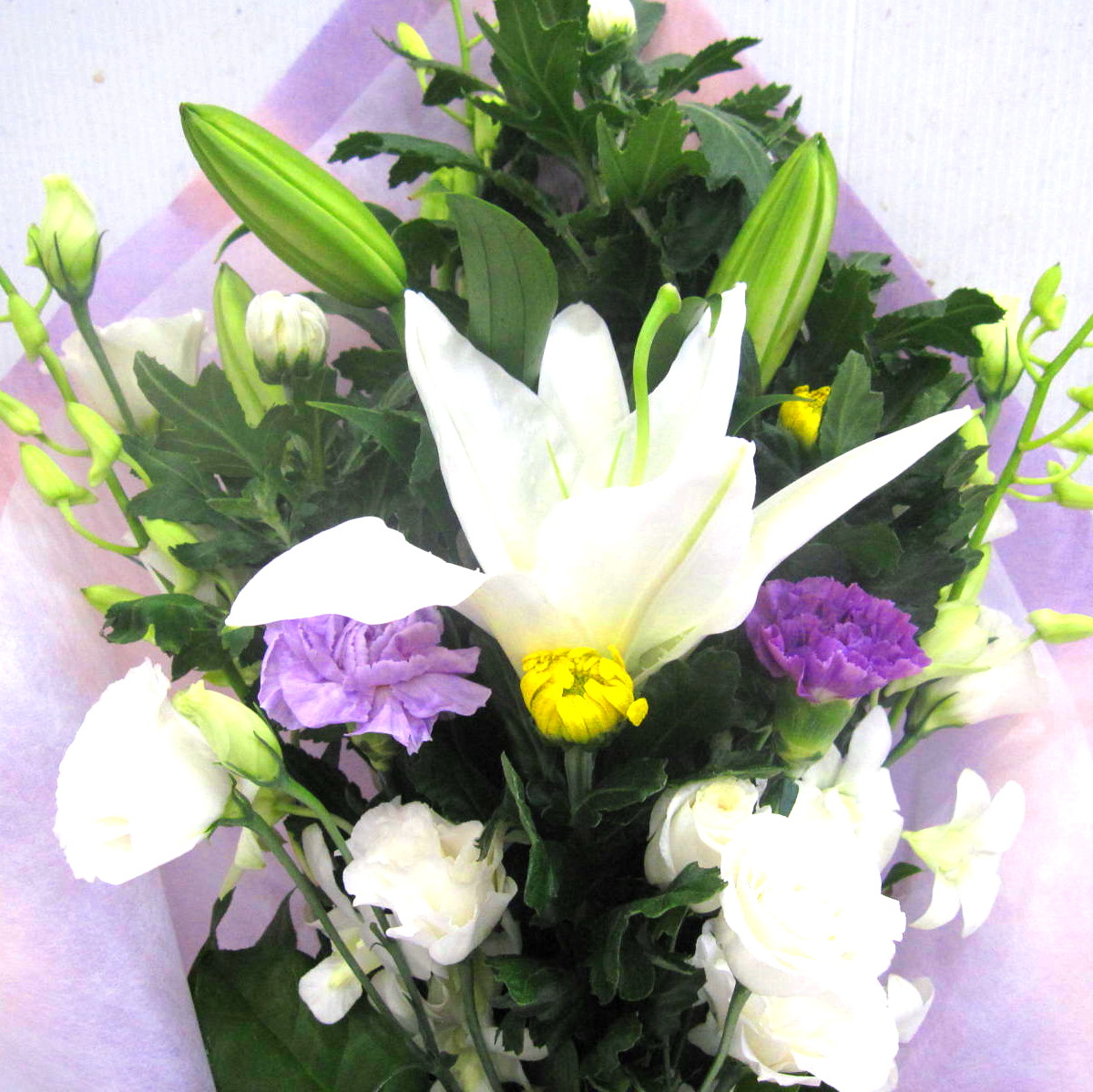 ユリ女王《カサブランカ》を入れた立派な花束。上品だったイメージのあの故人を優しく偲びます。【15時迄のご注文で翌日届きます】※こちらの商品についてのご相談、ご質問等ございましたら(メール)または(お電話)にて承ります。