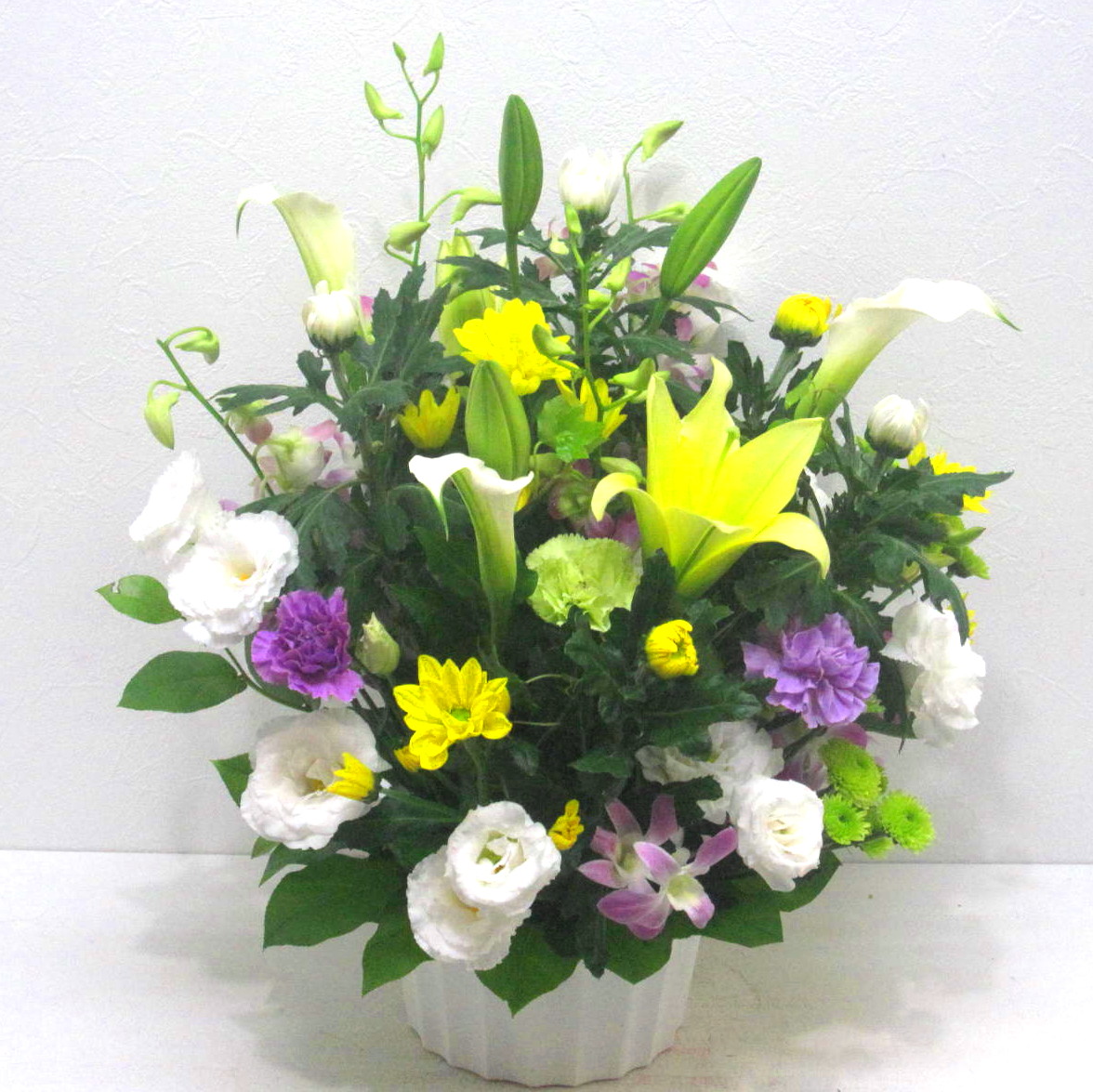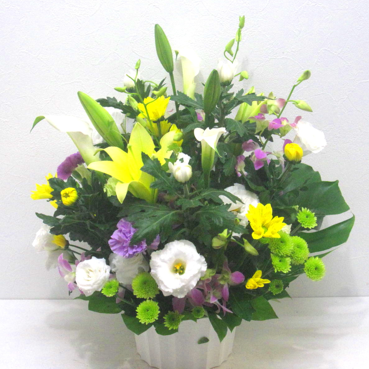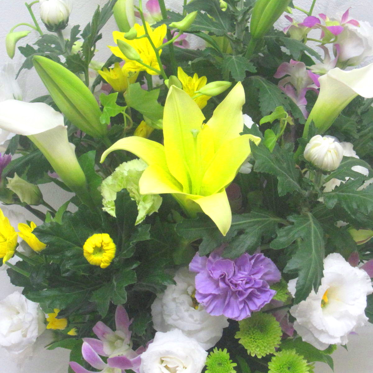 花材: メイン ユリ、キク、トルコギキョウ、カーネーションなど その他 葉物類など