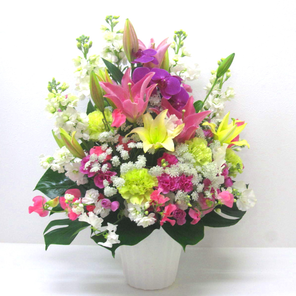 コチョウランを入れた春の立派なお供えアレンジメントです。明るめの華やかな雰囲気なのでお花が好きだった故人をそっと見守りながら偲びます。【15時迄のご注文で翌日届きます】※こちらの商品についてのご相談、ご質問等ございましたら(メール)または(お電話)にて承ります。春の期間限定(4月8日迄)