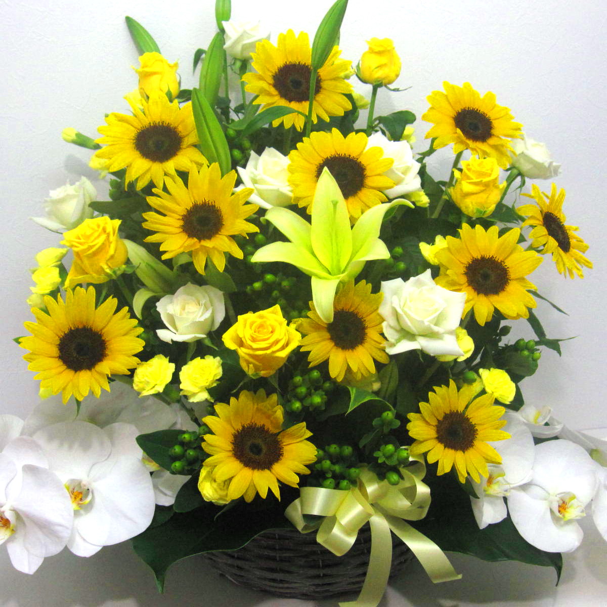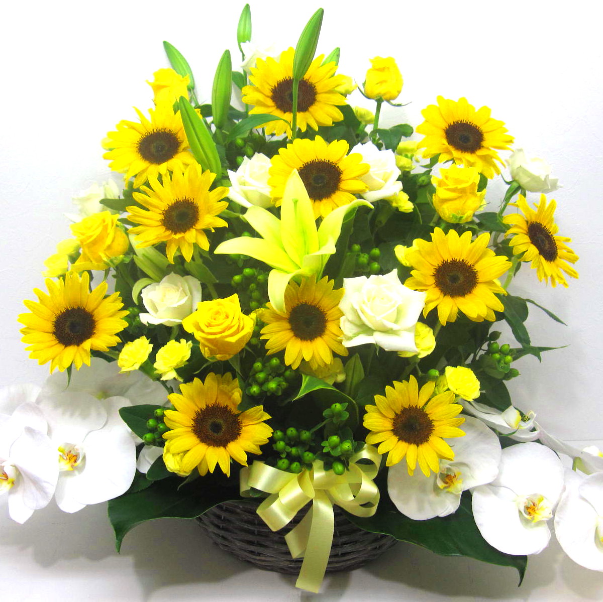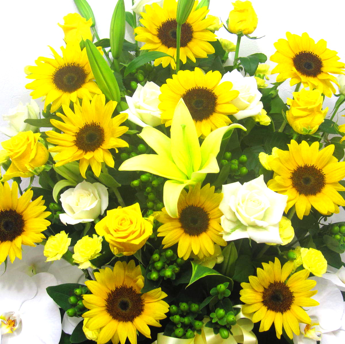 花材: メイン ひまわり、胡蝶蘭、ユリ、バラなど その他 実物類、葉物類