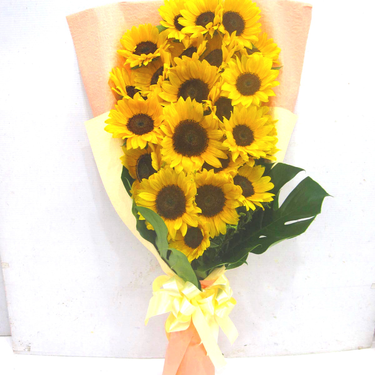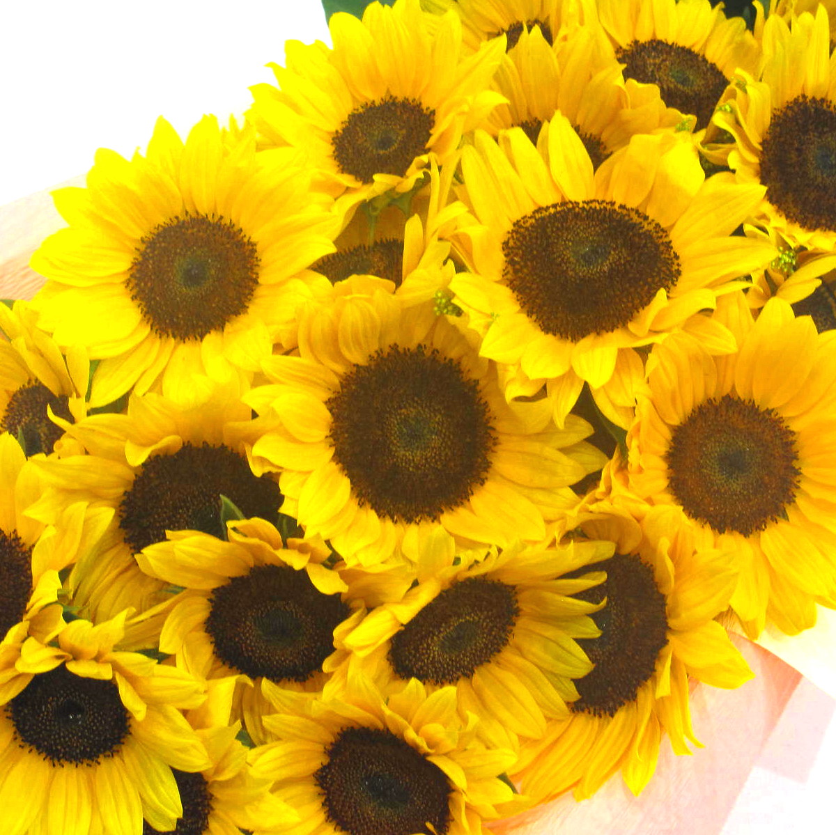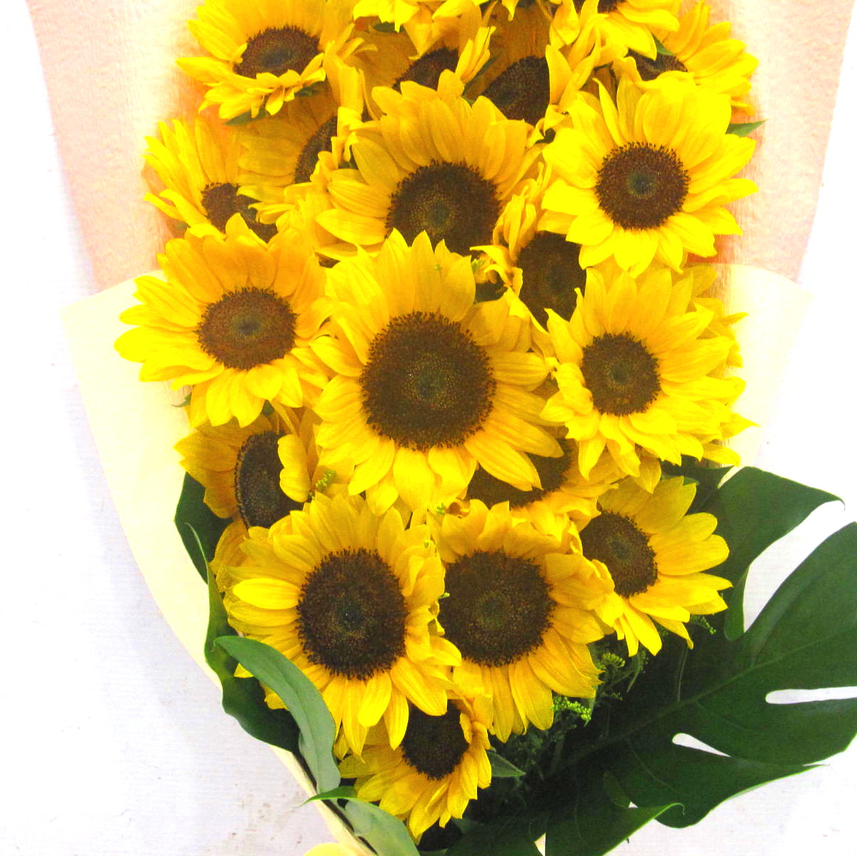 ひまわりのとても豪華な花束です。太陽の光をたくさん浴びて生き生きと育った新潟産のひまわり。ギラギラと美しく、茎もしっかりと太いです。特別の日のや大切な記念日に頂いた方は、きっと心に残るでしょう。記憶に残る素晴らしいヒマワリの花束。今の季節しかないお花に想いを込めて贈りませんか。ラッピングにもこだわり上品にお包みします。また、持ちの良いお花を中心に使っておりますので花持ちも良いでしょう。ご購入されたお客様から高い評価を頂いております。静岡県長泉町から日本全国【真心】込めてお届けいたします。さまざまなご用途に贈る贈り物としてオススメです。大切な方へ贈るフラワーギフトやプレゼントなら「花樹園オンラインドットコム」に是非、お任せ下さいませ。
