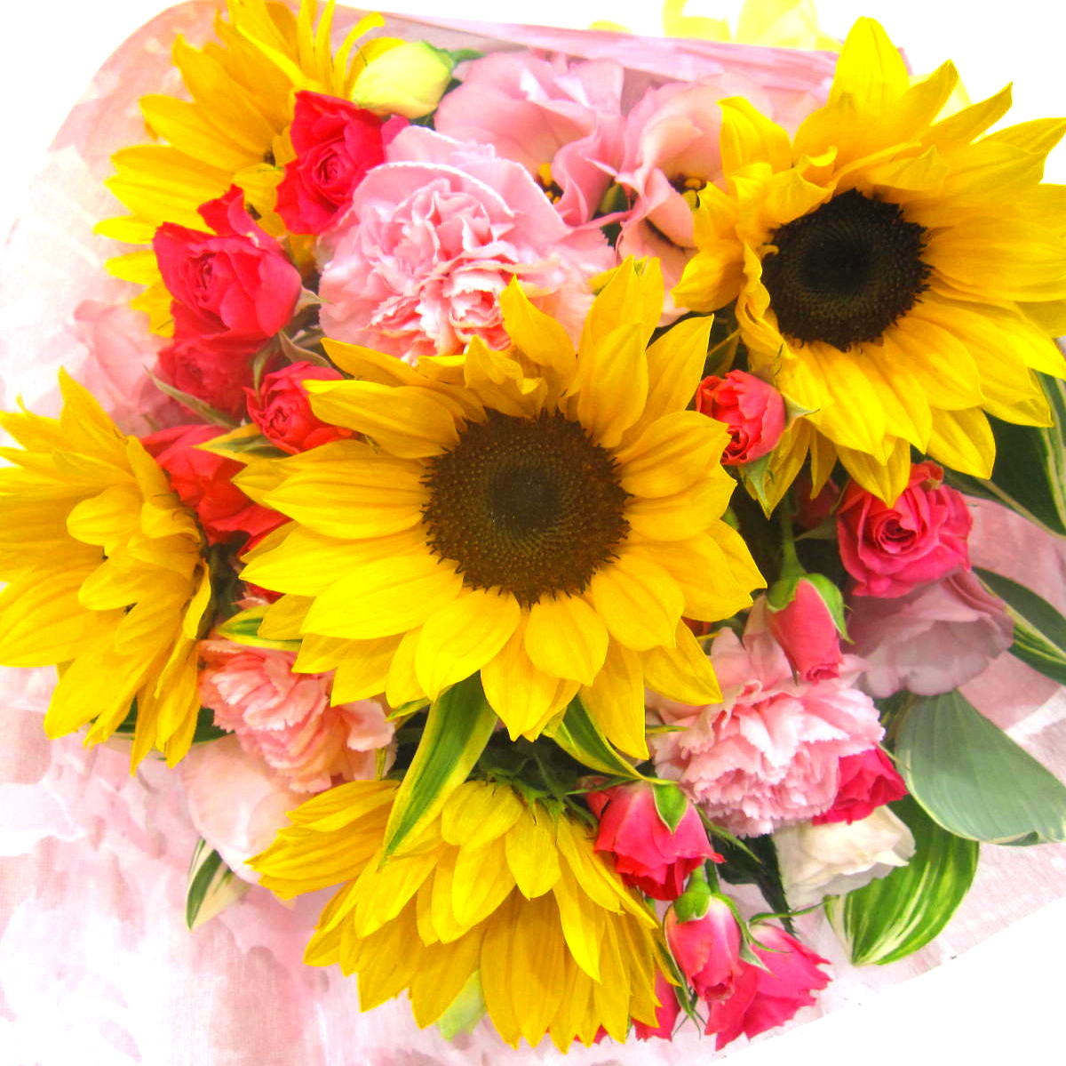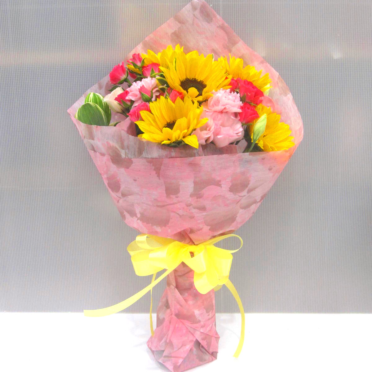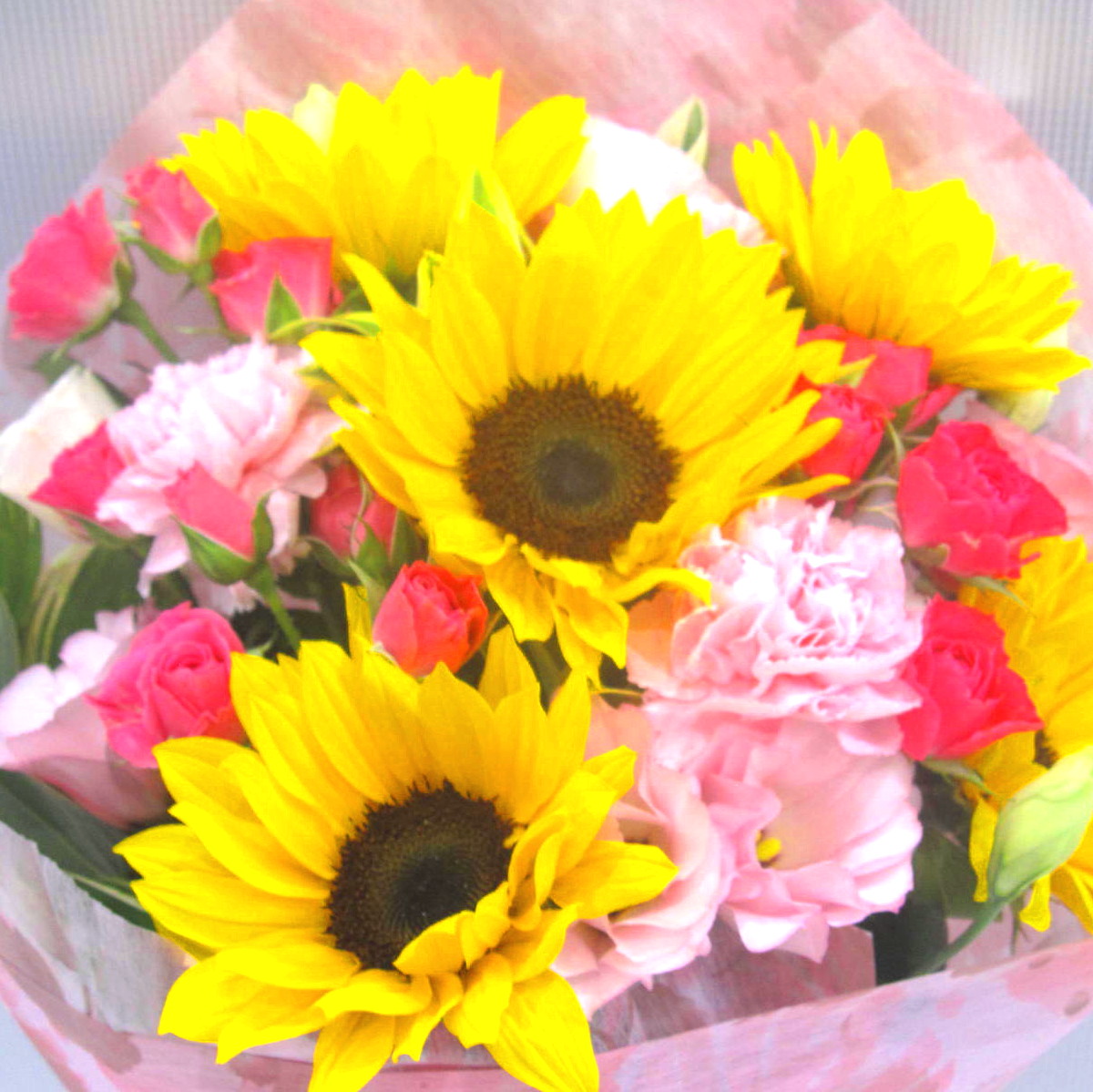 人気の高い《ひまわりやバラ》を主体としたラブリーな雰囲気が漂う花束。【15時迄のご注文で翌日届きます】※こちらの商品についてのご相談、ご質問等ございましたら(メール)または(お電話)にて承ります。