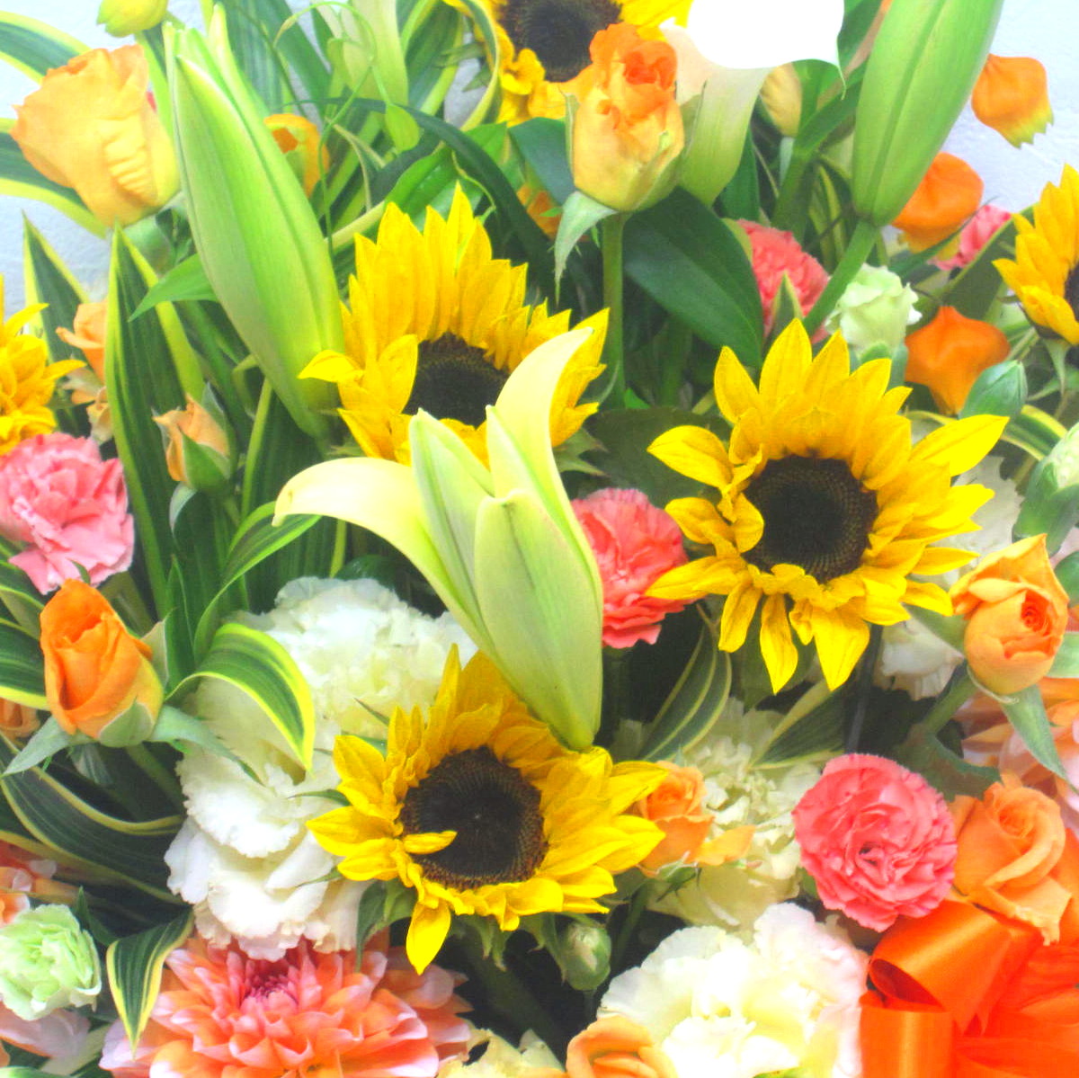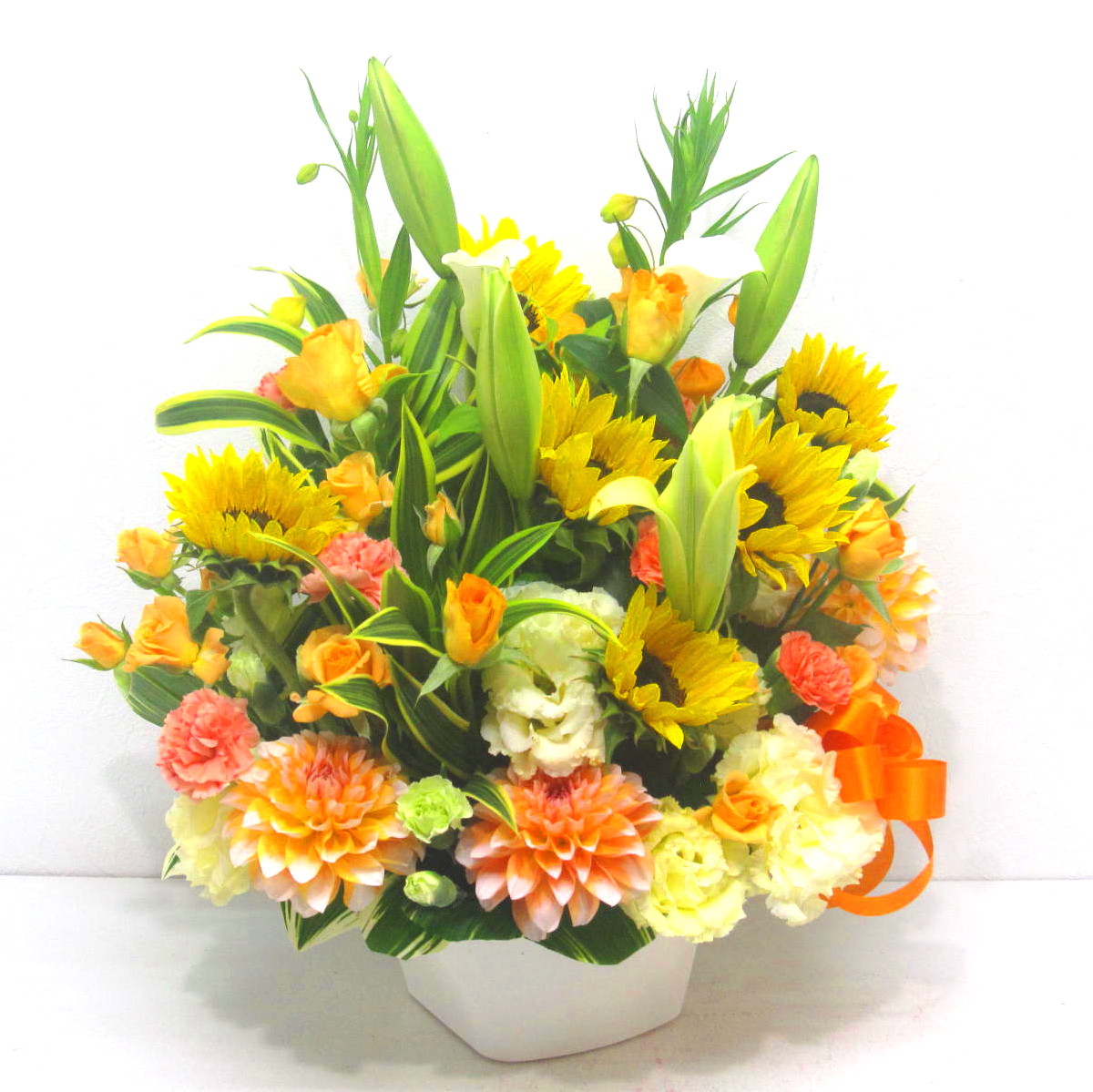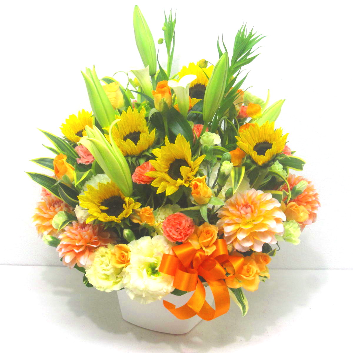 花材: メイン ユリ、ヒマワリ、バラ、トルコギキョウ、ダリアなど その他 葉物類など