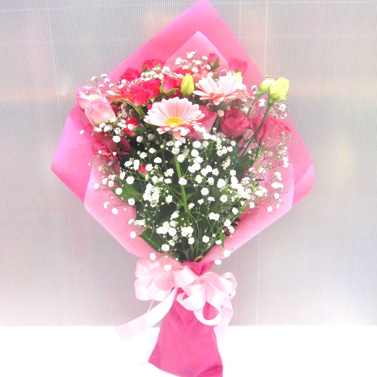 人気の高いお花を中心にまとめたピンク系の花束です。バラ、ガーベラ、トルコギキョウ、カスミソウが入っていてボリュームよく華やかにお作りします。ラッピングも上品にお包み致します。また、持ちの良いお花を中心に使っておりますので花持ちも良いでしょう。ご購入されたお客様から高い評価を頂いております。静岡県長泉町から日本全国【真心】込めてお届けいたします。さまざまなご用途に贈る贈り物としてオススメです。大切な方へ贈るフラワーギフトやプレゼントなら「花樹園オンラインドットコム」に是非、お任せ下さいませ。